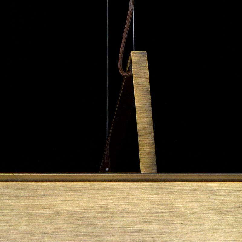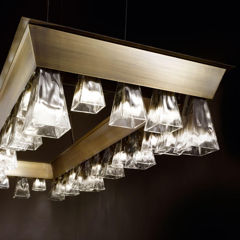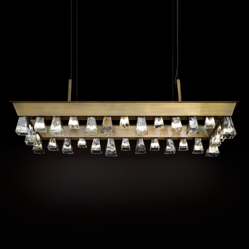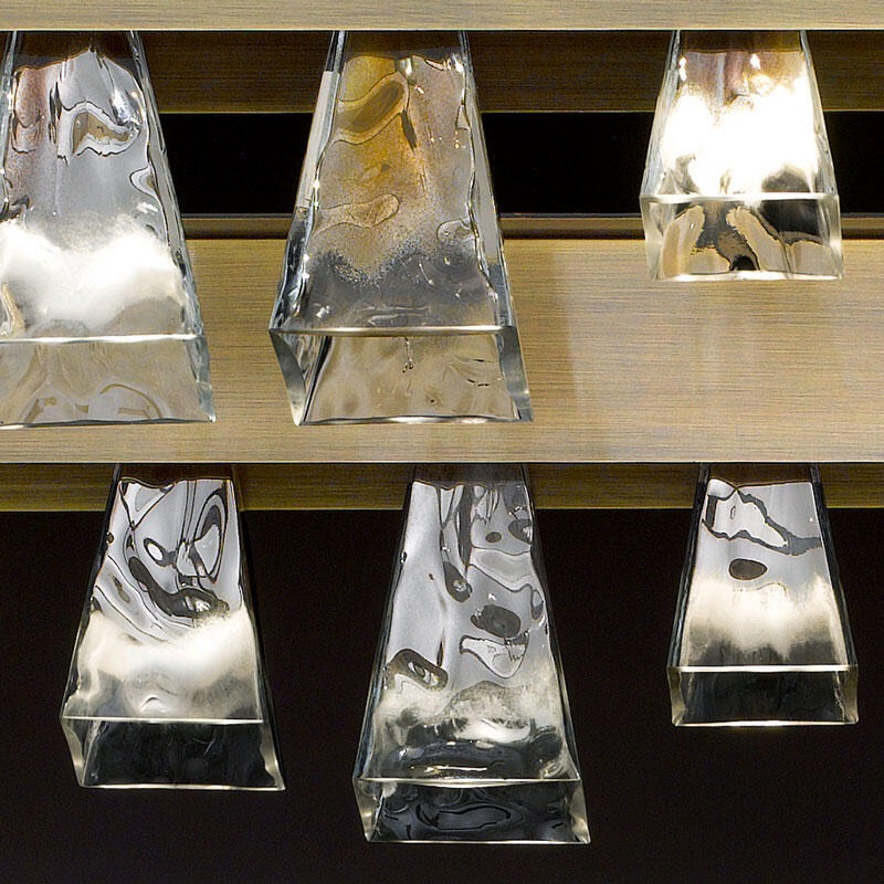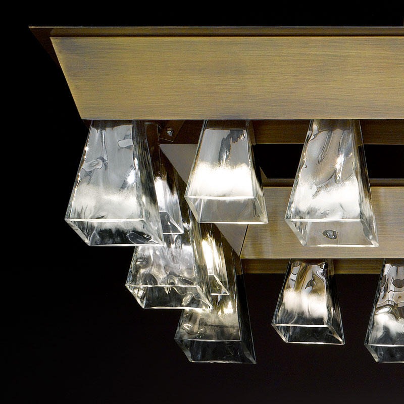 Прямоугольная металлическая конструкция с отделкой из античной латуни. Абажуры из муранского стекла конической формы с эффектом чеканки и частичным античным серебрением ручной работы.