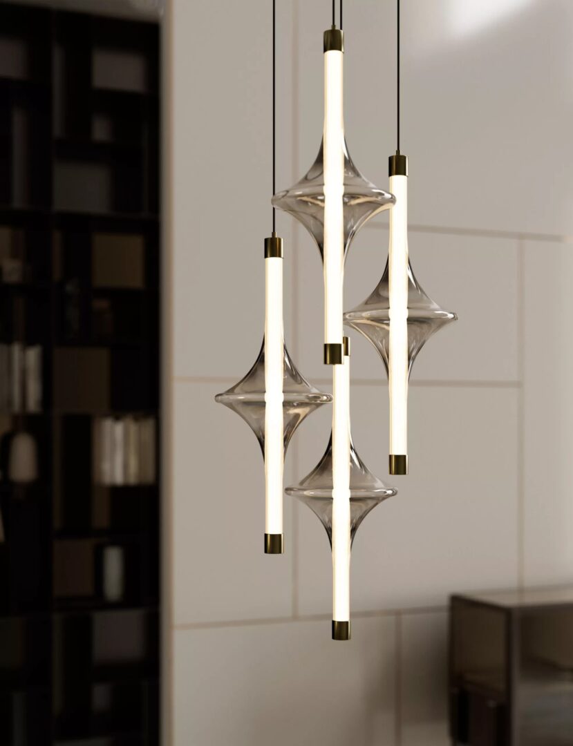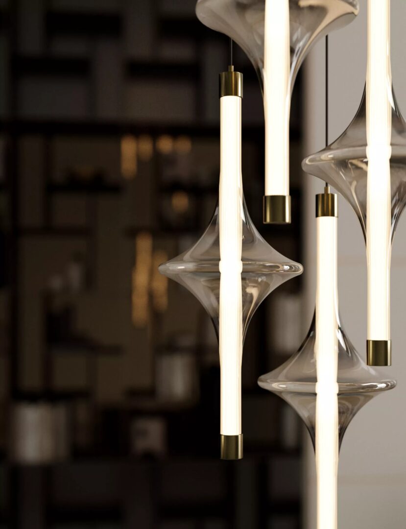 Люстра с подвесной конструкцией из натуральной латуни с наружным стеклом из дымчатого боросиликатного стекла и внутренними продольными полосами.