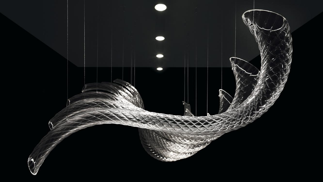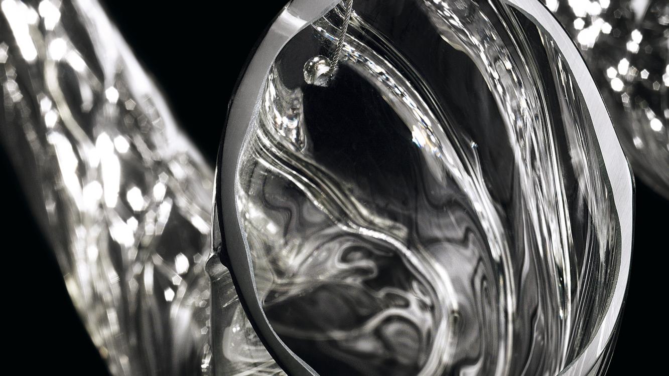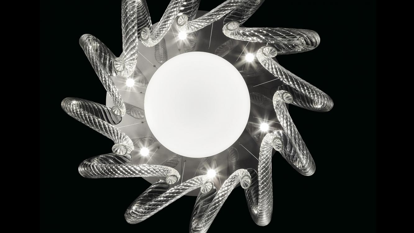 Основой светильника стал венецианский хрусталь, обработанный по уникальной технике «балотон». Этот метод, передаваемый в семье Barovier из поколения в поколение, придает материалу особую прозрачность и глубину. Металлические элементы выполнены из нержавеющей стали, обеспечивающей долговечность и современный эстетический контраст.
