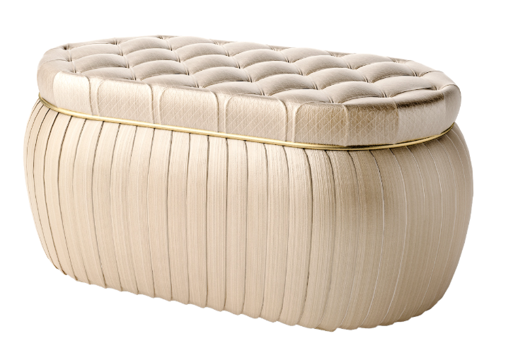 У каждого из нас есть укромное местечко для хранения наших секретов, наших пороков, наших добродетелей; пуф для вечного хранения, кажется, был создан именно для этого. Используемые драгоценные ткани и тонкая ручная работа с чередованием плиссировки и капитонной прострочки придают интерьеру романтическую и изысканную современность, способную украсить как главную спальню, так и детскую комнату.