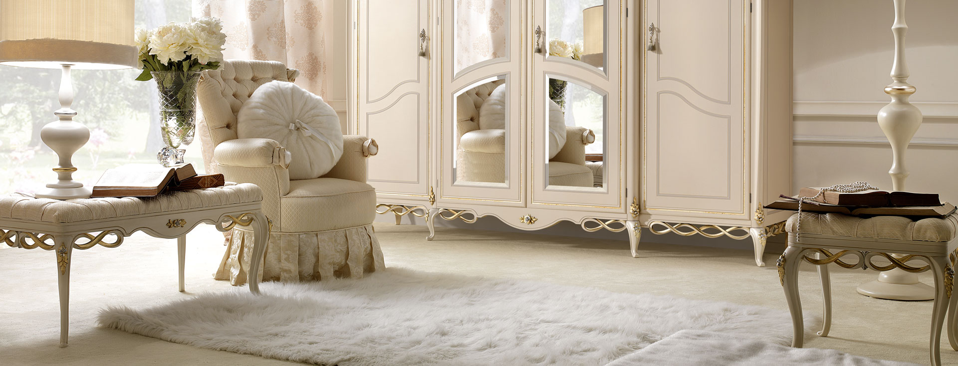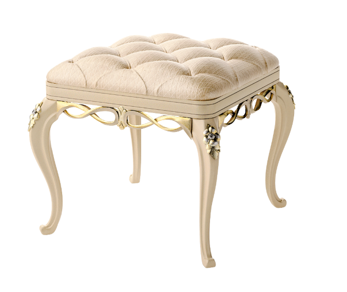 Деревянный пуф с мягким сиденьем-капитоне, украшенным плетениями и розами, вырезанными из сусального золота. Настоящая жемчужина, неподвластная времени, которая может сама по себе украсить маленький уголок, идеально сочетается с туалетом или, в пастельных тонах, с настольной консолью для самых маленьких.