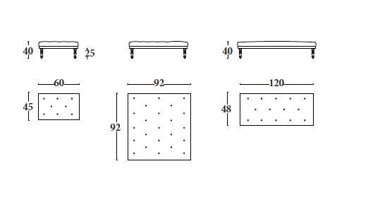Версии: пуф 60×45, 120×48, 92×92. Структура: древесина и ее производные. Набивка: пенополиуретан с различными размерами и качеством, полиэфирные волокна. Особенности: открытые ноги в цветах, предусмотренных в каталоге.