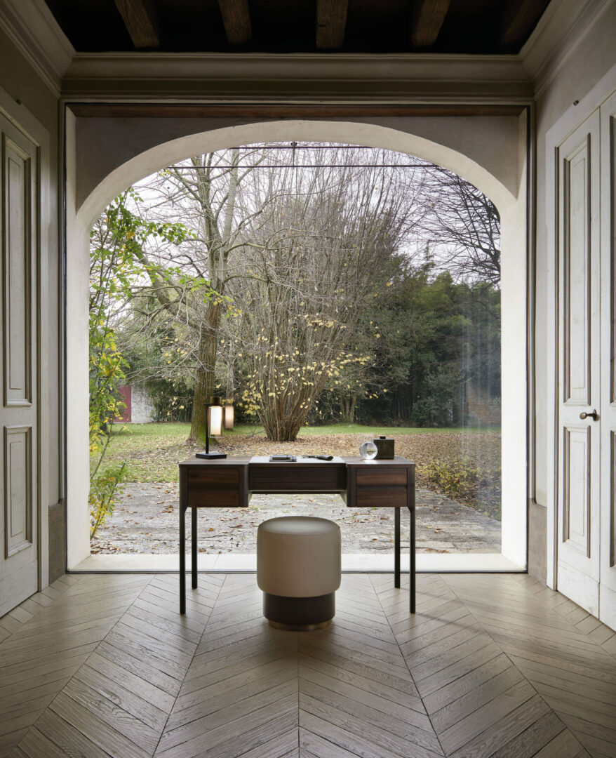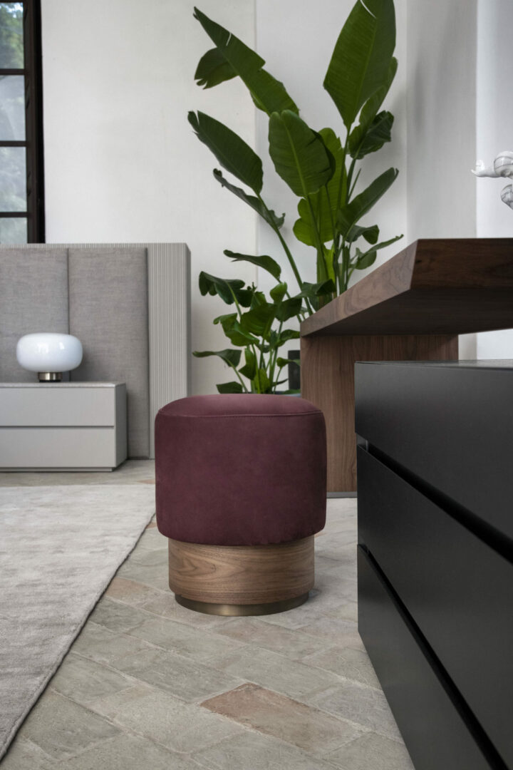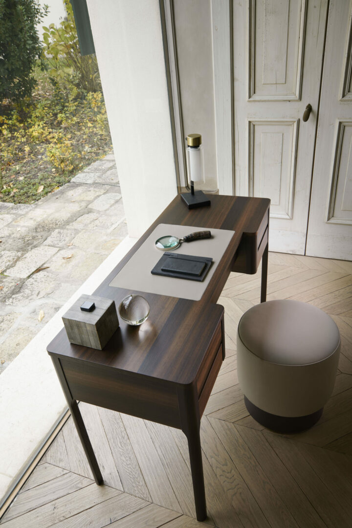 Основание, облицованное шпоном из цельного дерева, сочетается с удобным круглым сиденьем из кожи или ткани, которое поддерживается круглой металлической ножкой, окрашенной или из полированной латуни.