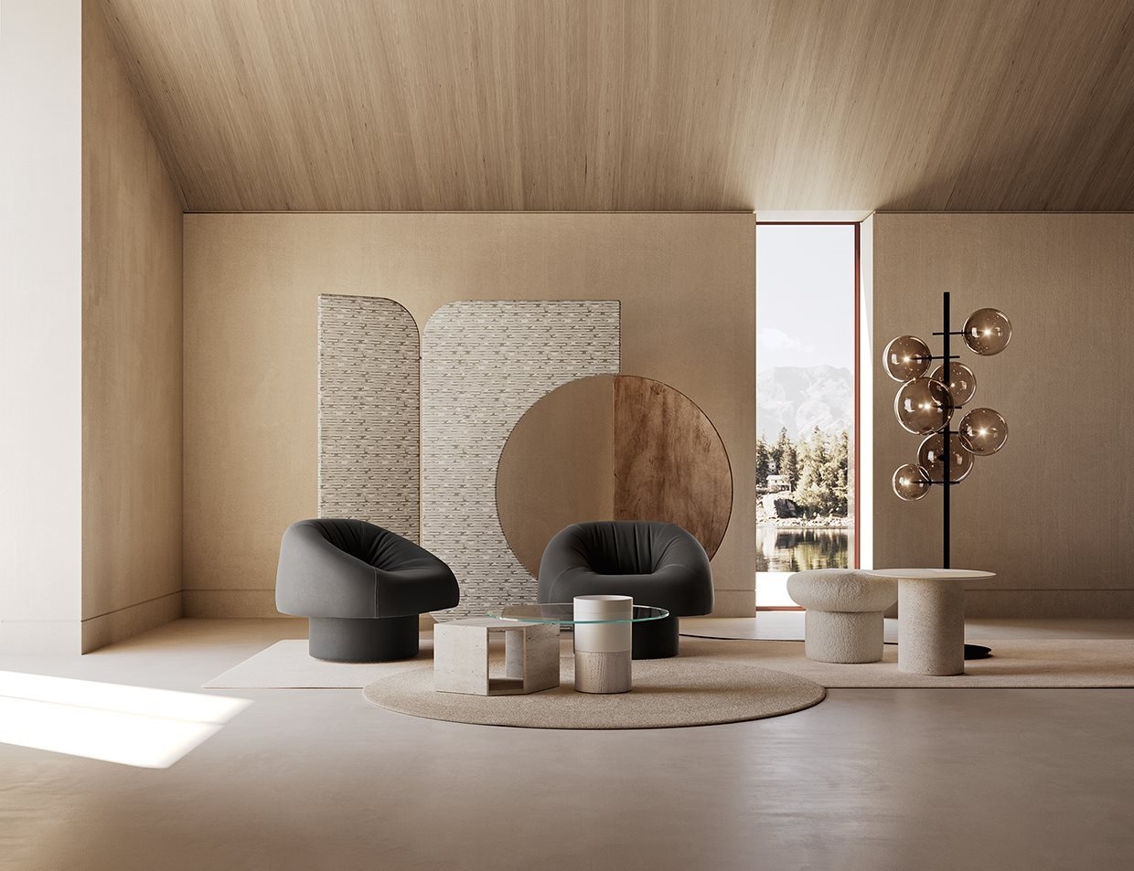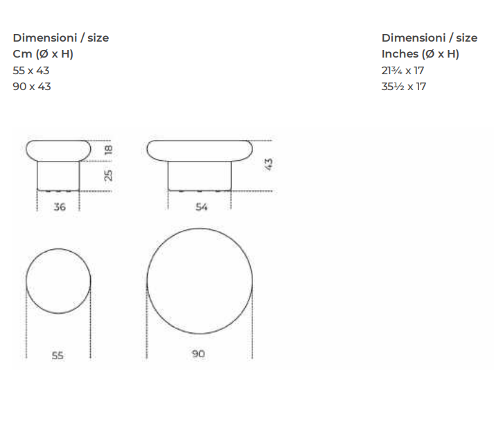 Пуф с внутренней структурой из дерева и производных, наполненный непреобразуемым пенополиуретаном различной плотности и полиэфирным волокном.