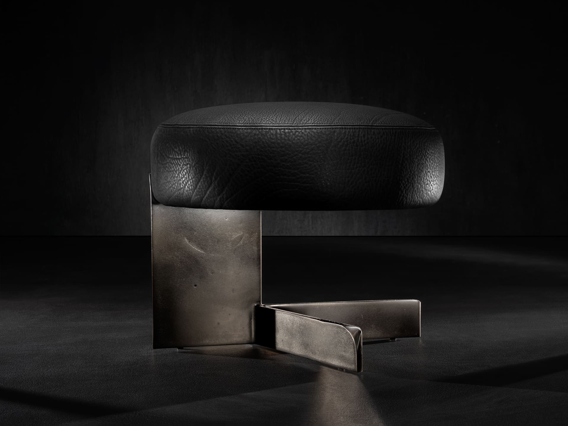 Эклектичный и универсальный аксессуар — пуф Tambourine, играющий на контрасте между строгой металлической ножкой и мягким круглым сиденьем, создает характерный яркий декоративный акцент.