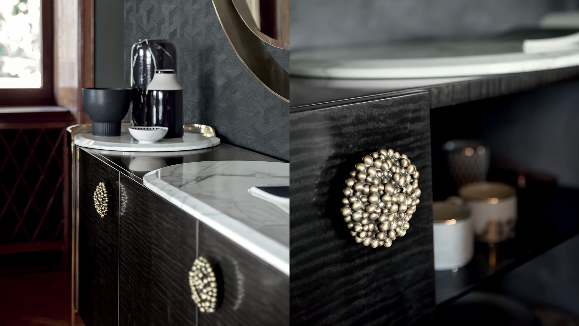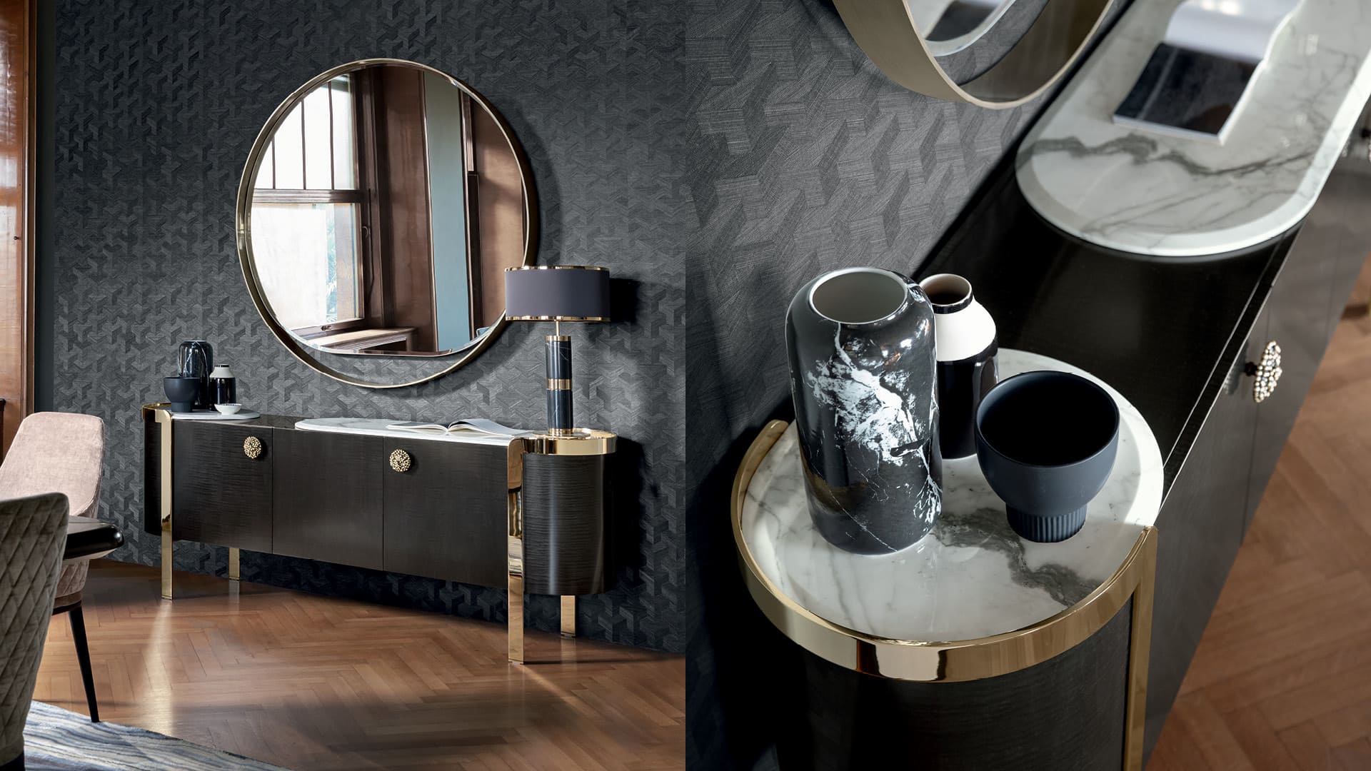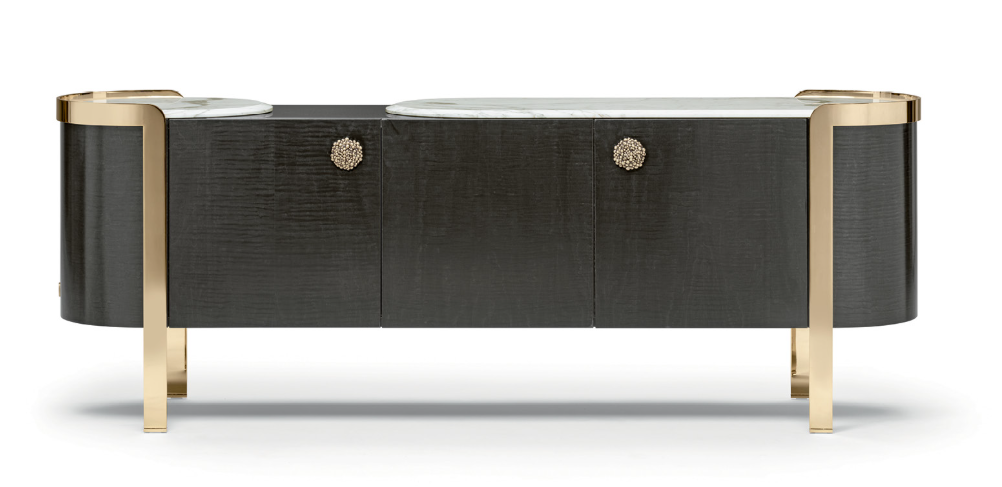 Трехдверный сервант Doris отличается драгоценными деталями, скульптурным силуэтом и деревянной конструкцией. Шедевр, напоминающий о великом мастерстве Opera Contemporary.