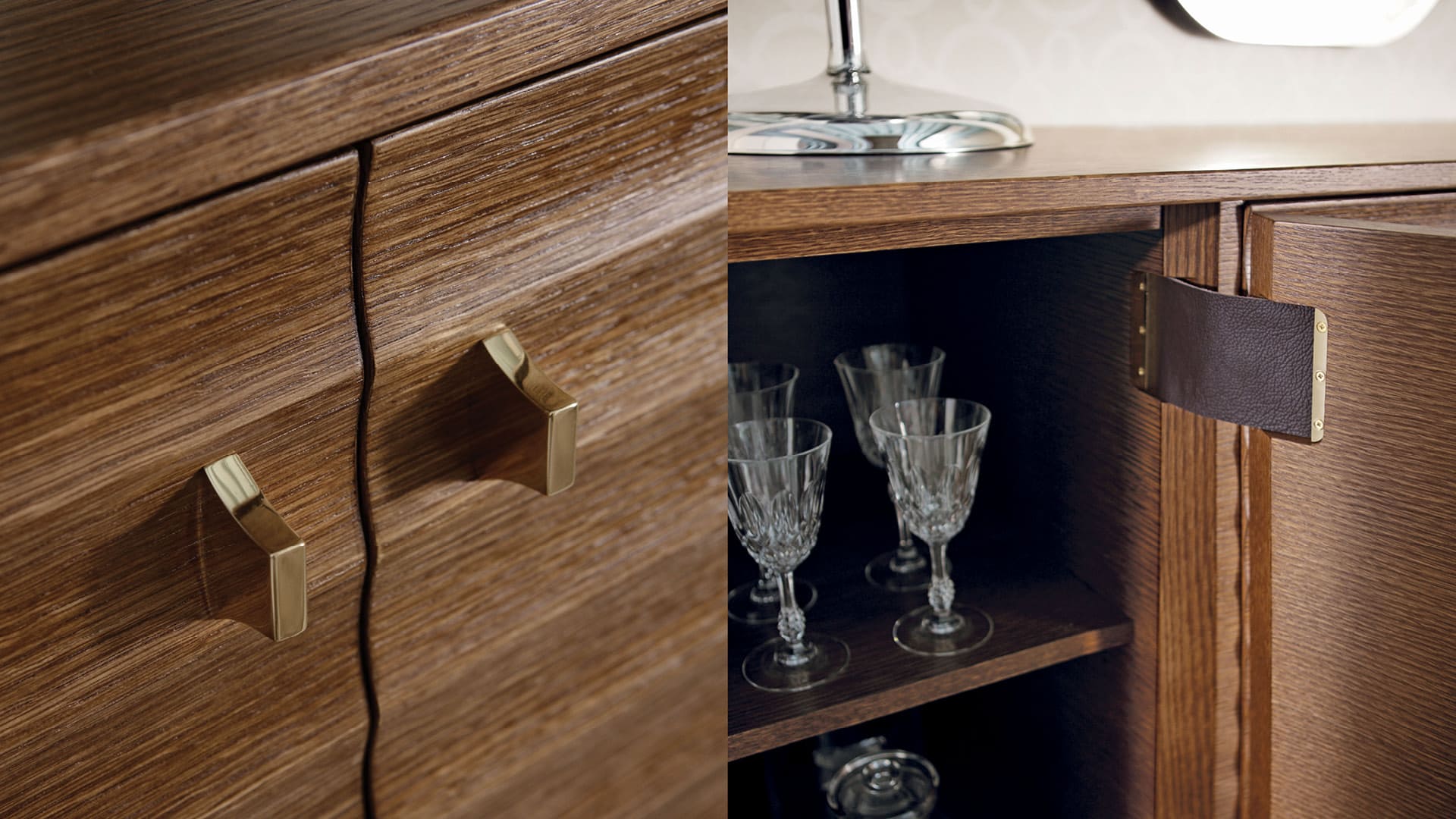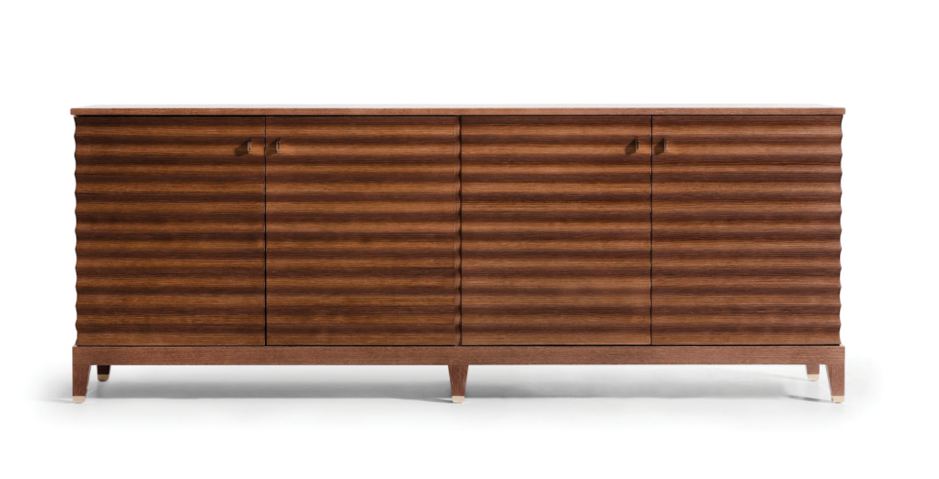 Четырехдверный сервант Elettra украшен элегантной волнистой отделкой на дверцах и боковинах. Интерьер шкафа выглядит просторным и изысканным благодаря отделке дверных петель тонкой кожей.