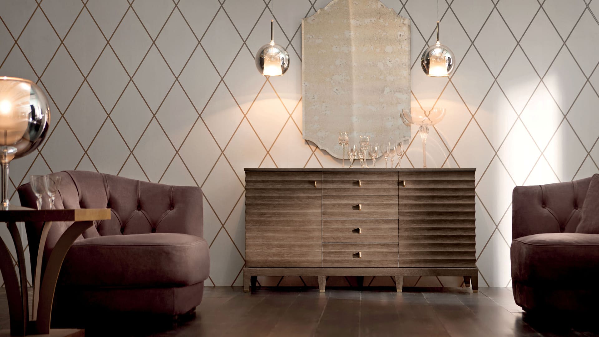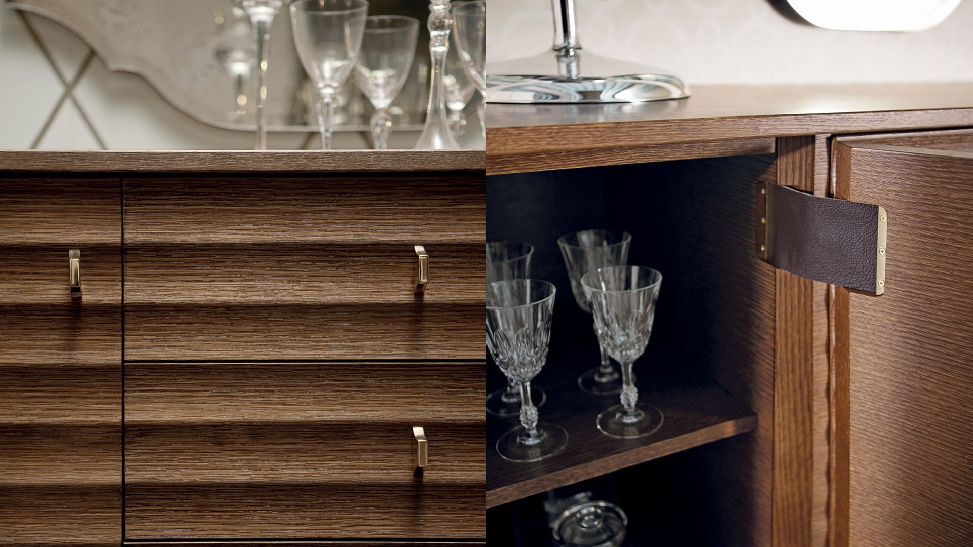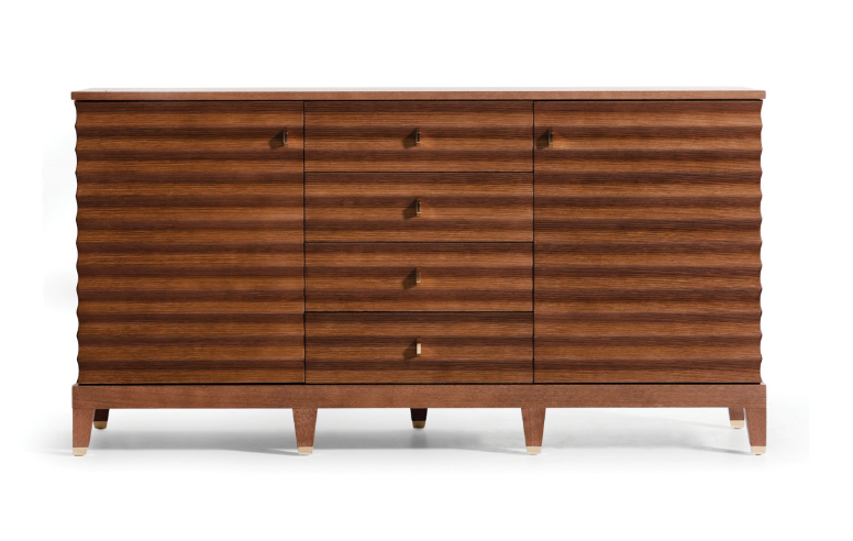 Сервант с дверцами и выдвижными ящиками Elettra отличается элегантной волнистой отделкой на дверцах и боковинах. Интерьер шкафа отличается просторностью благодаря большим отделениям и удобным четырем центральным выдвижным ящикам.