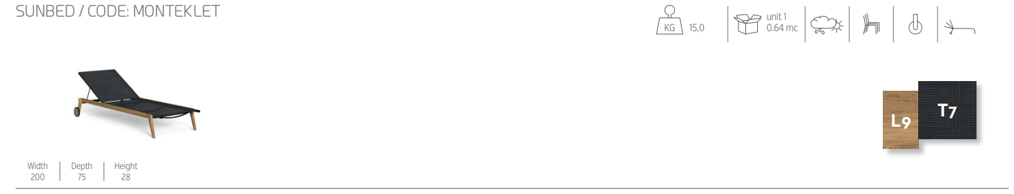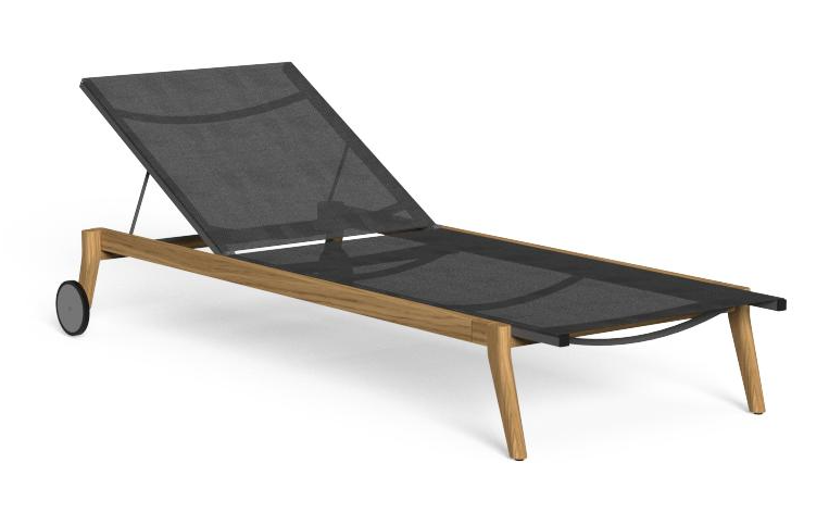 Шезлонг Moon раскладывается благодаря стойке из нержавеющей стали и оснащен колесиками. Простота линий подчеркивает натуральную древесину тика, которая, подобно каркасу, выделяется на фоне черной текстильной обивки сиденья.