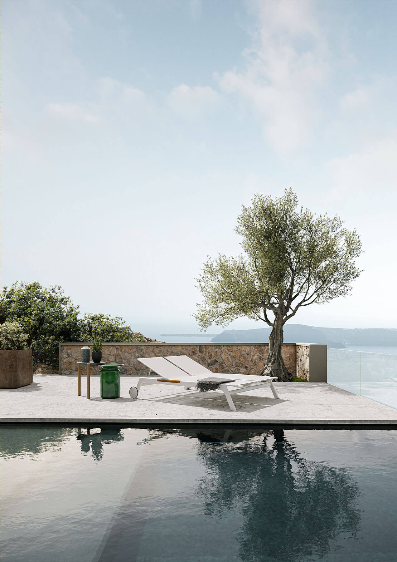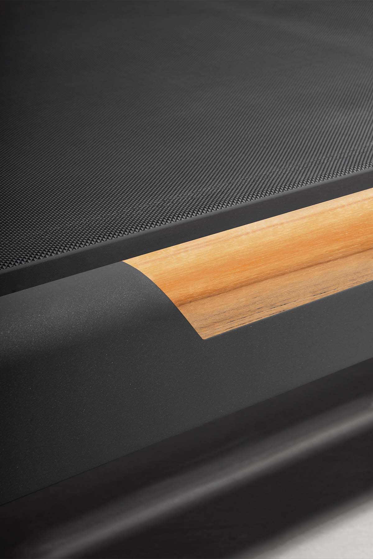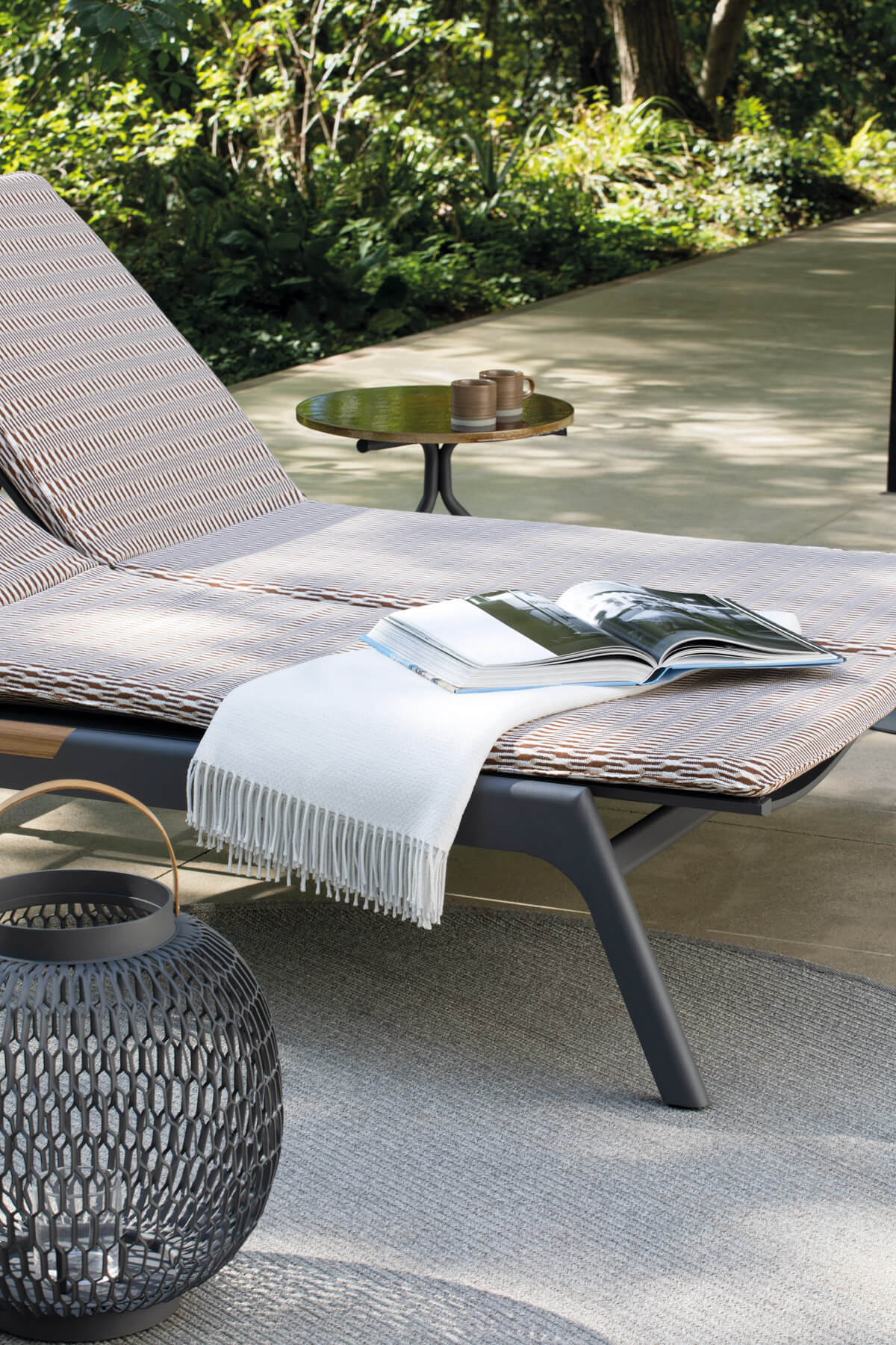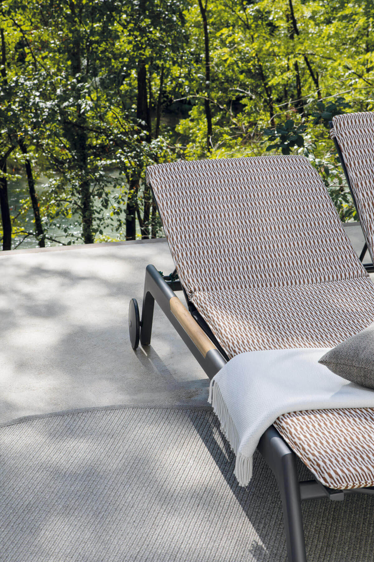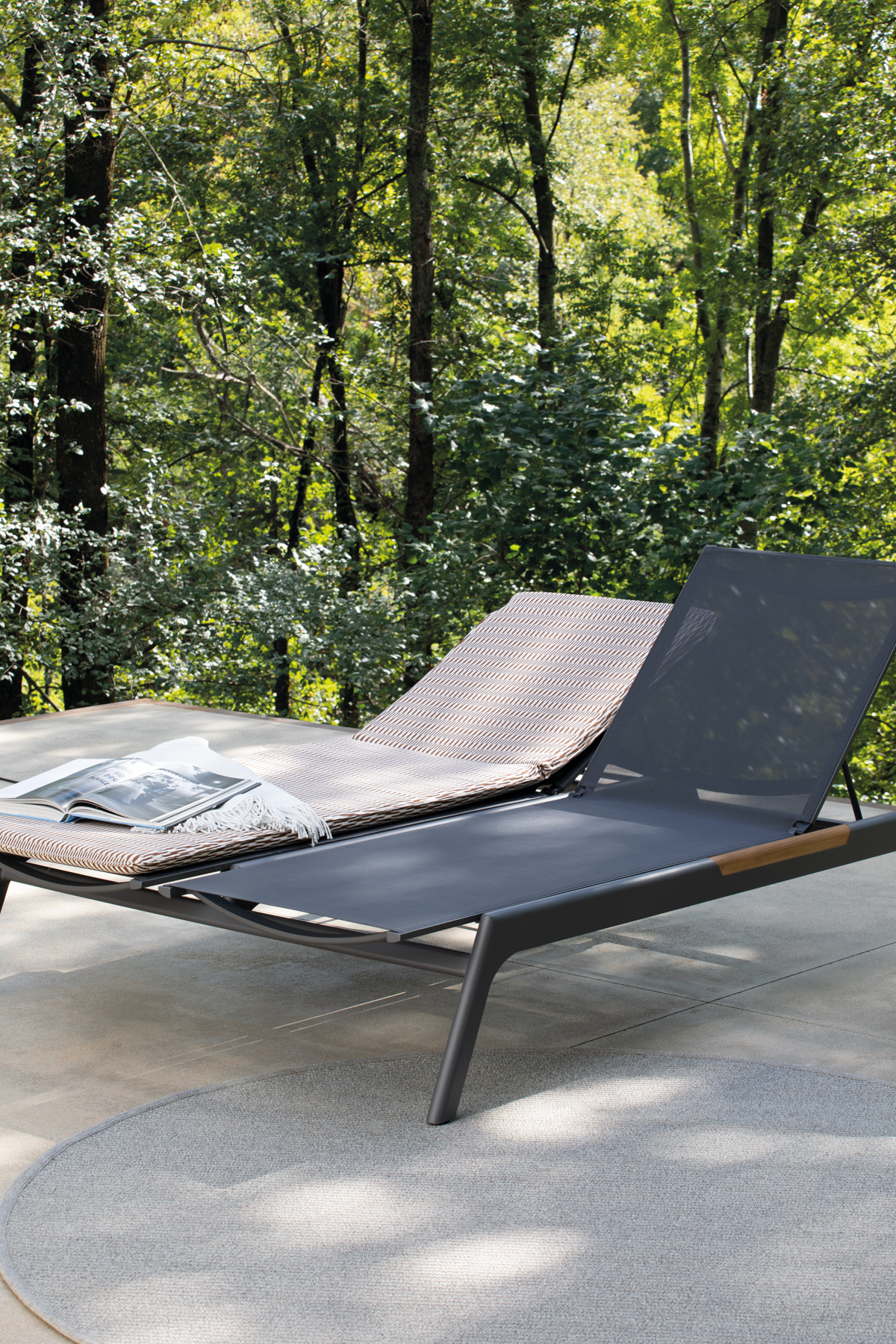 Чистый и неподвластный времени. Шезлонг из графитового или белого алюминия со вставками из тикового дерева идеально подходит для использования на открытом воздухе и может быть адаптирован к любому контексту, от жилого до гостиничного.