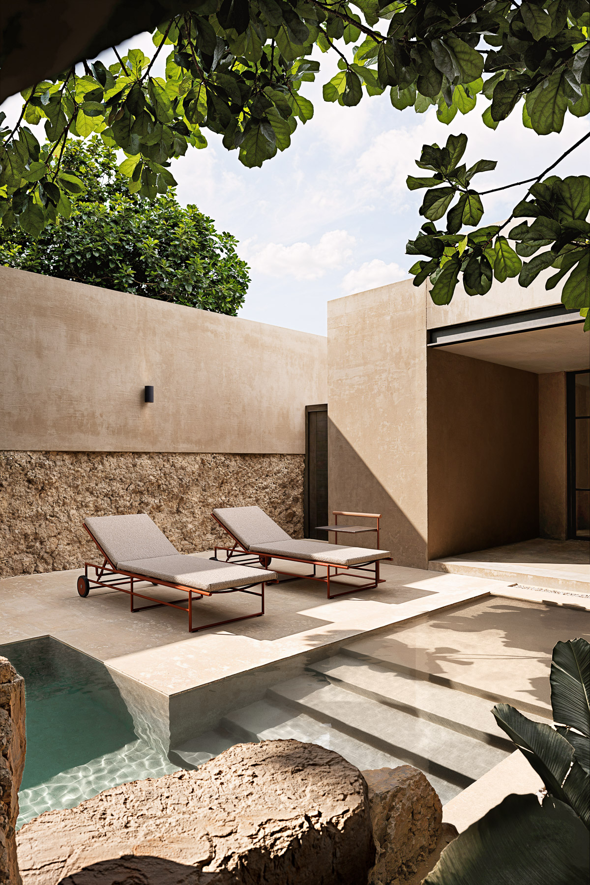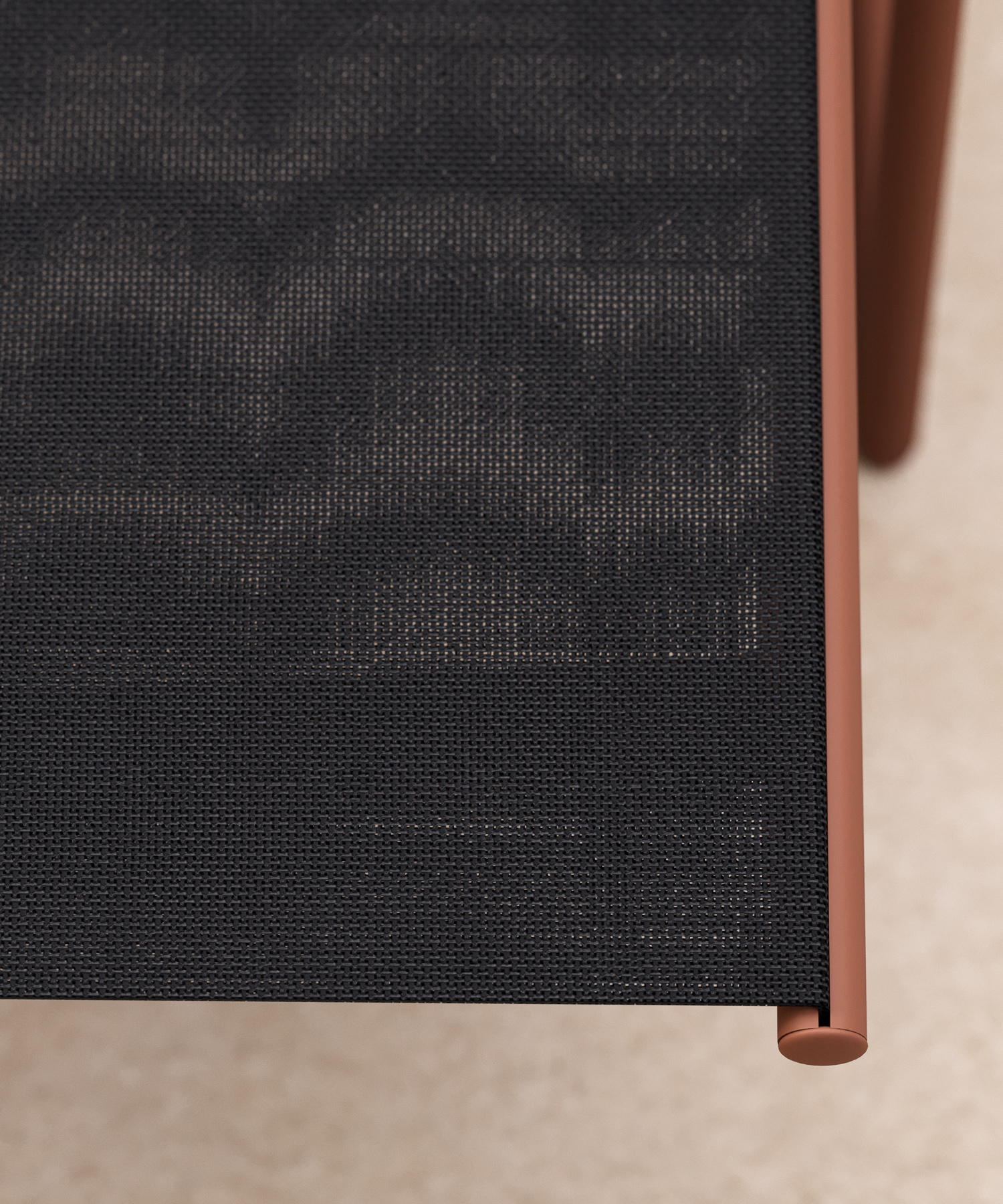 Шезлонг с дизайном, отличающимся смелой геометрией, имеет круглую трубчатую стальную раму с эпоксидным покрытием, которое обеспечивает легкость и устойчивость к атмосферным воздействиям. Сиденье из текстиля обеспечивает воздухопроницаемость, простоту очистки и пригодность для использования на открытом воздухе.