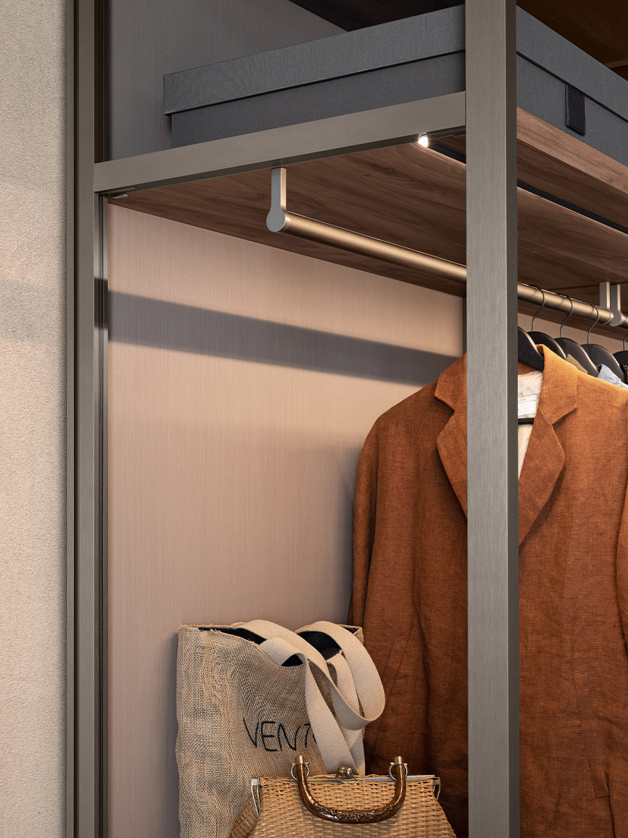Гардероб Aria Cabina отличается современным, но вневременным дизайном, который легко впишется как в классические, так и в ультрасовременные интерьеры. Система позволяет комбинировать различные элементы, создавая уникальные конфигурации: