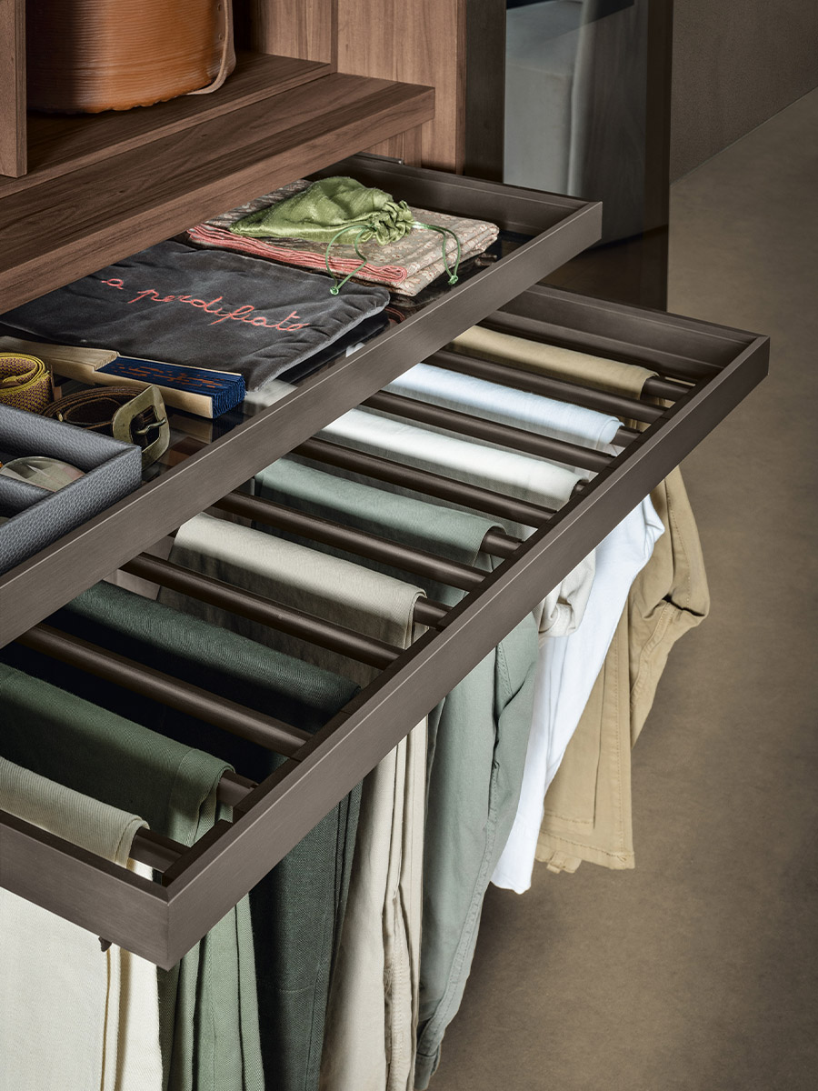 Гардероб оснащен передовыми системами хранения, которые делают его использование максимально удобным:
