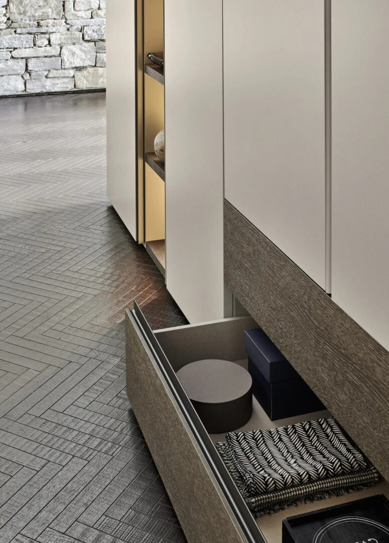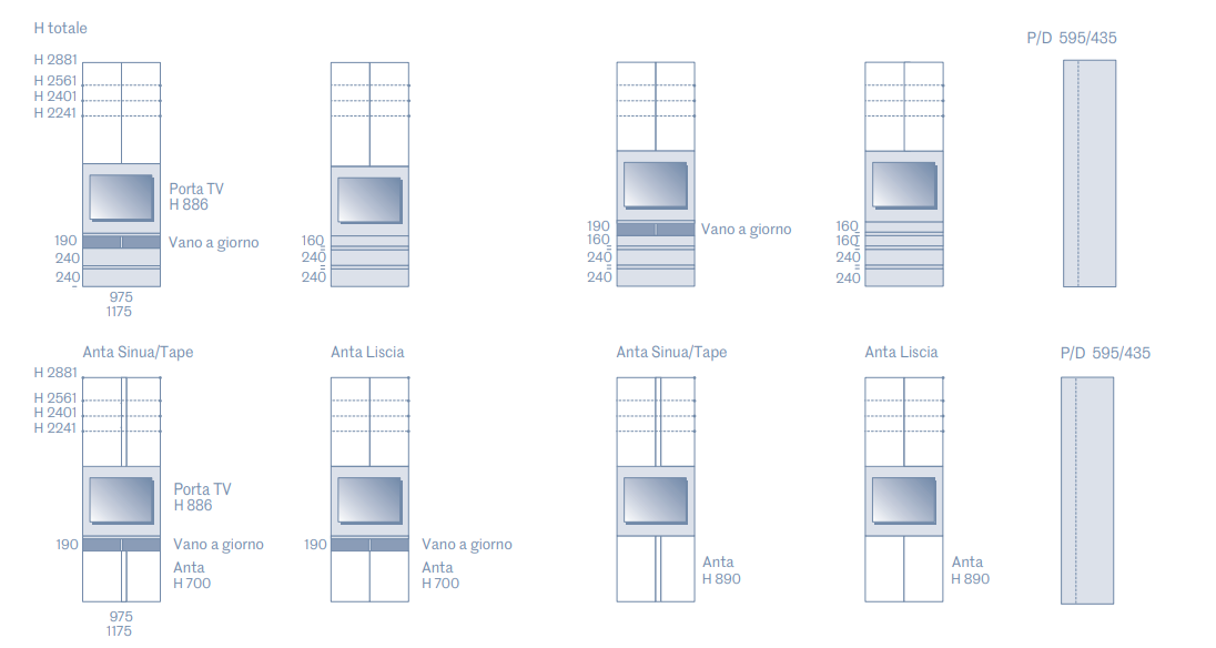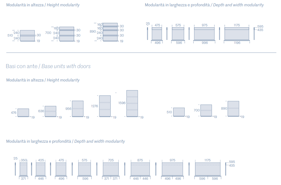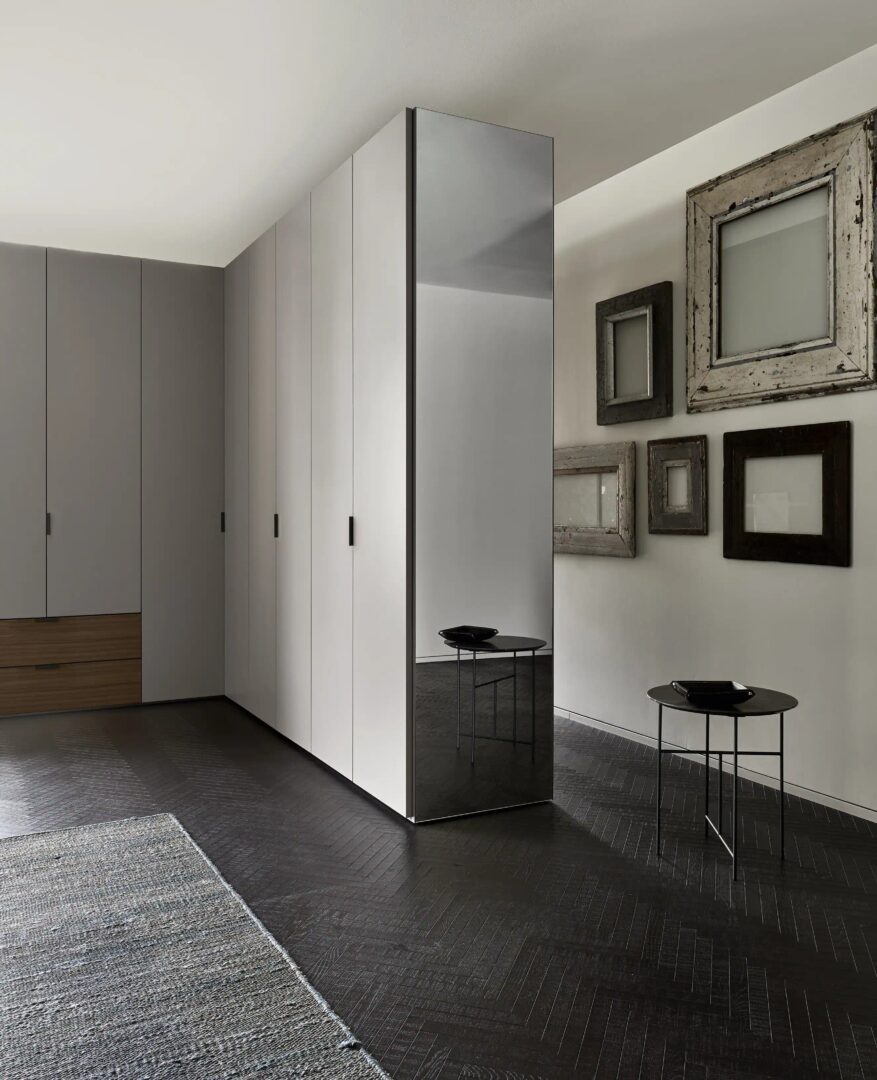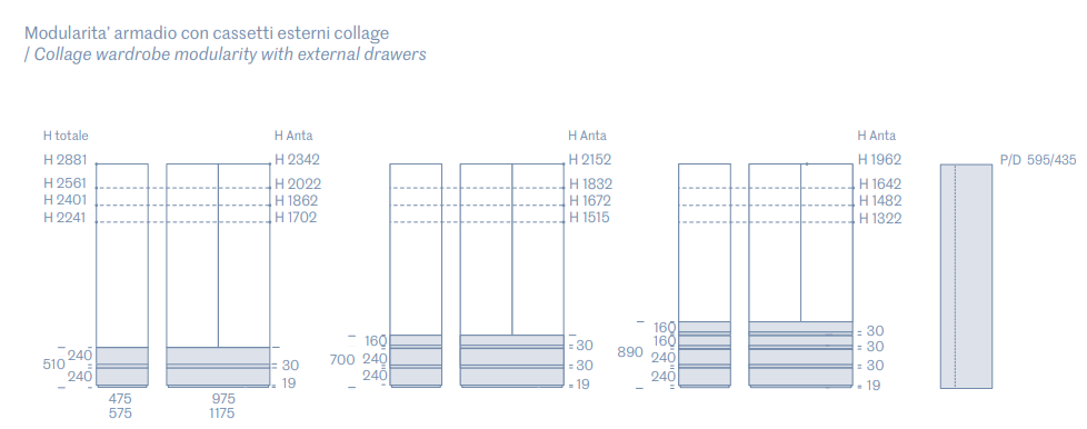 Благодаря сочетанию различных композиций, готовых и подходящих, горизонтальных и вертикальных элементов, возникает шкаф Collage, решение, характеризующееся распашными дверцами, которое хорошо адаптируется к самым различным типам окружающей среды, улучшая его элегантностью и большой трезвостью.