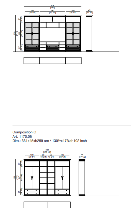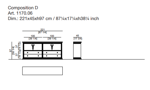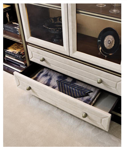 Изготовлен из качественных материалов: лакированное дерево, бронзовые профили и техническая ткань для дна ящиков. Итальянское производство гарантирует безупречную детализацию и долговечность. Подходит для классических и современных интерьеров.