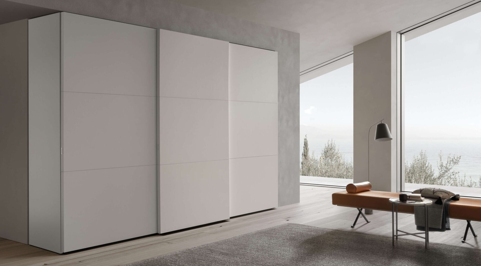 Шкаф-купе с тремя дверцами, передняя поверхность которого разделена двумя горизонтальными вставками на три равные, но отдельные секции. Индивидуализация достигается за счет широкого ассортимента матовых лакокрасочных покрытий, а также возможности выбора различных цветов дверей по запросу, что позволяет создать универсальное и стилистически изысканное решение для меблировки.