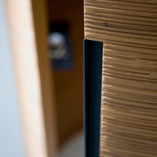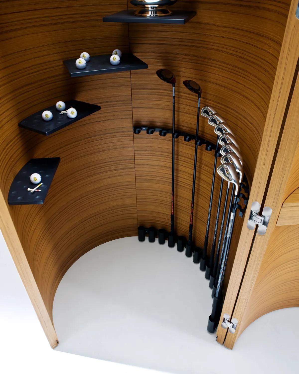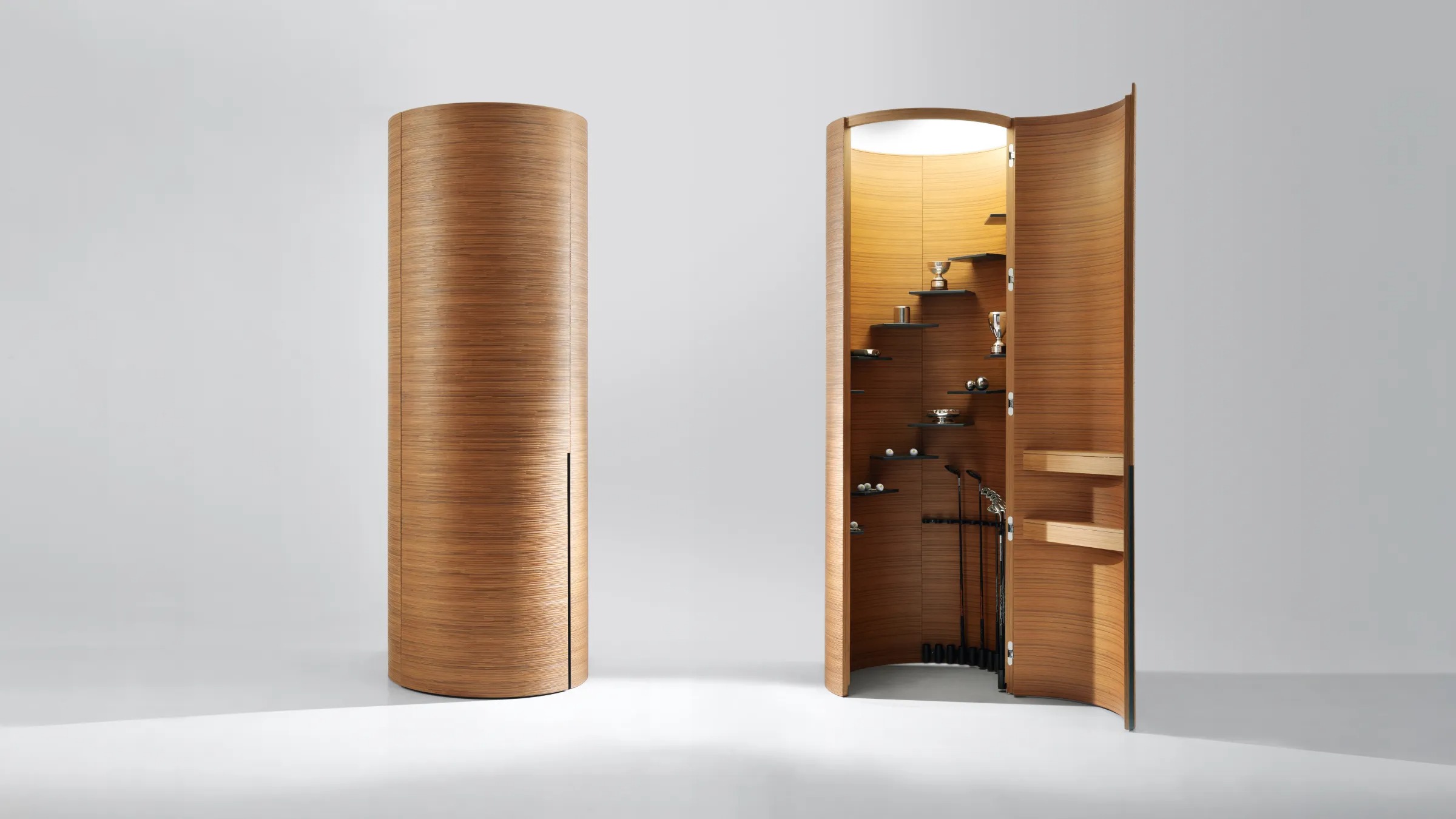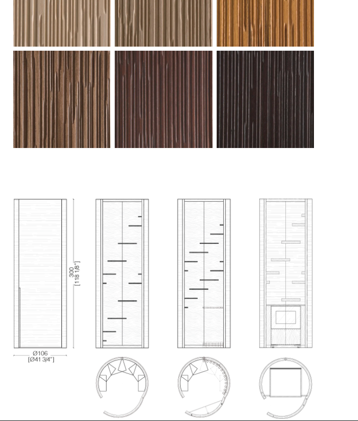 Шкаф цилиндрической формы из шпонированного дерева с горизонтальной резьбой Decor. Верхняя панель из опалового оргстекла со светодиодной подсветкой.