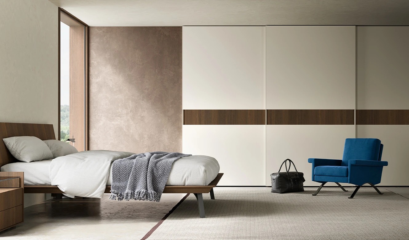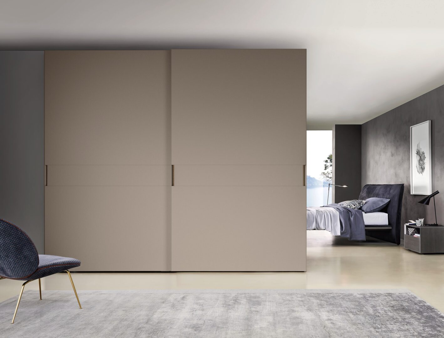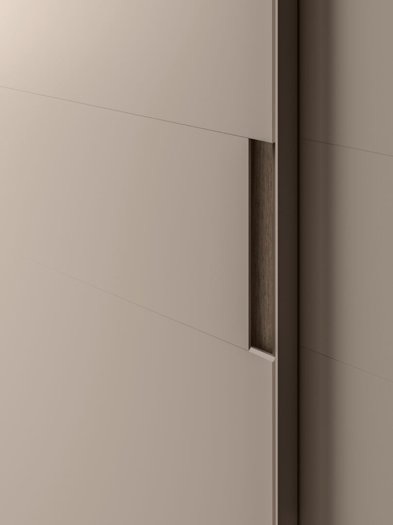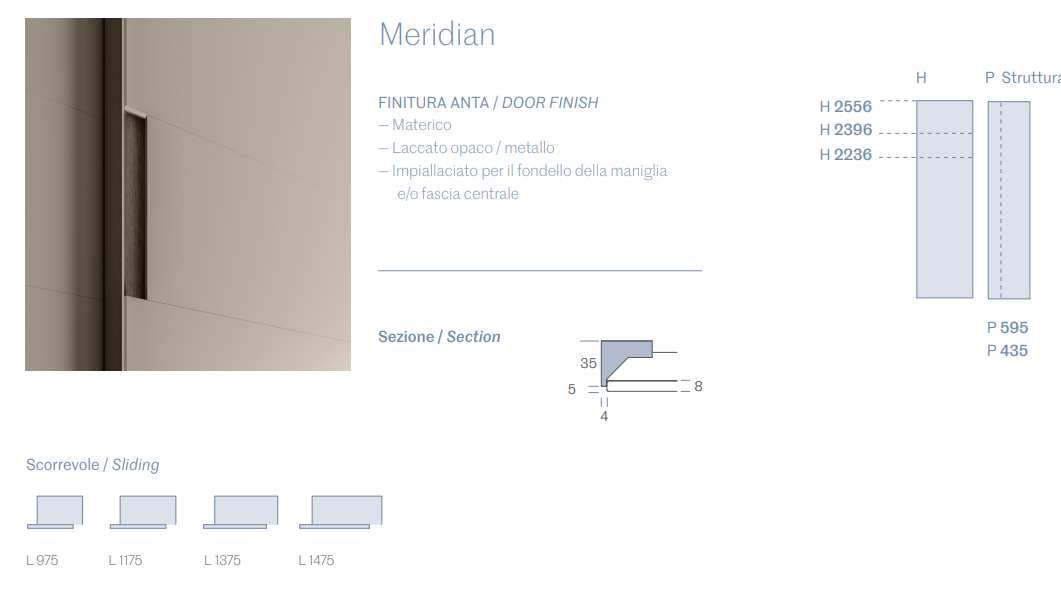 Система Meridian предлагает современные раздвижные или копланарные двери с прочной конструкцией и безупречной формальной чистотой. Плоские поверхности разделены горизонтальными полосами, которые нарушают визуальную непрерывность, стимулируя новые текстурные и цветовые комбинации. Отделка, доступная как в однотонном, так и в контрастном цвете, позволяет персонализировать каждый проект мебели элегантным и функциональным способом. Ручки дверей Meridian являются отличительным элементом благодаря своей ручной работе, способной добавить эстетическую и тактильную ценность всей композиции. Двери толщиной 40 мм обеспечивают ощущение прочности и превосходного качества, подчеркивая структурный характер шкафа. В одной из конфигураций модель представлена в матовом лакированном сером Corda, сдержанной и универсальной отделке, подходящей для любой среды.
