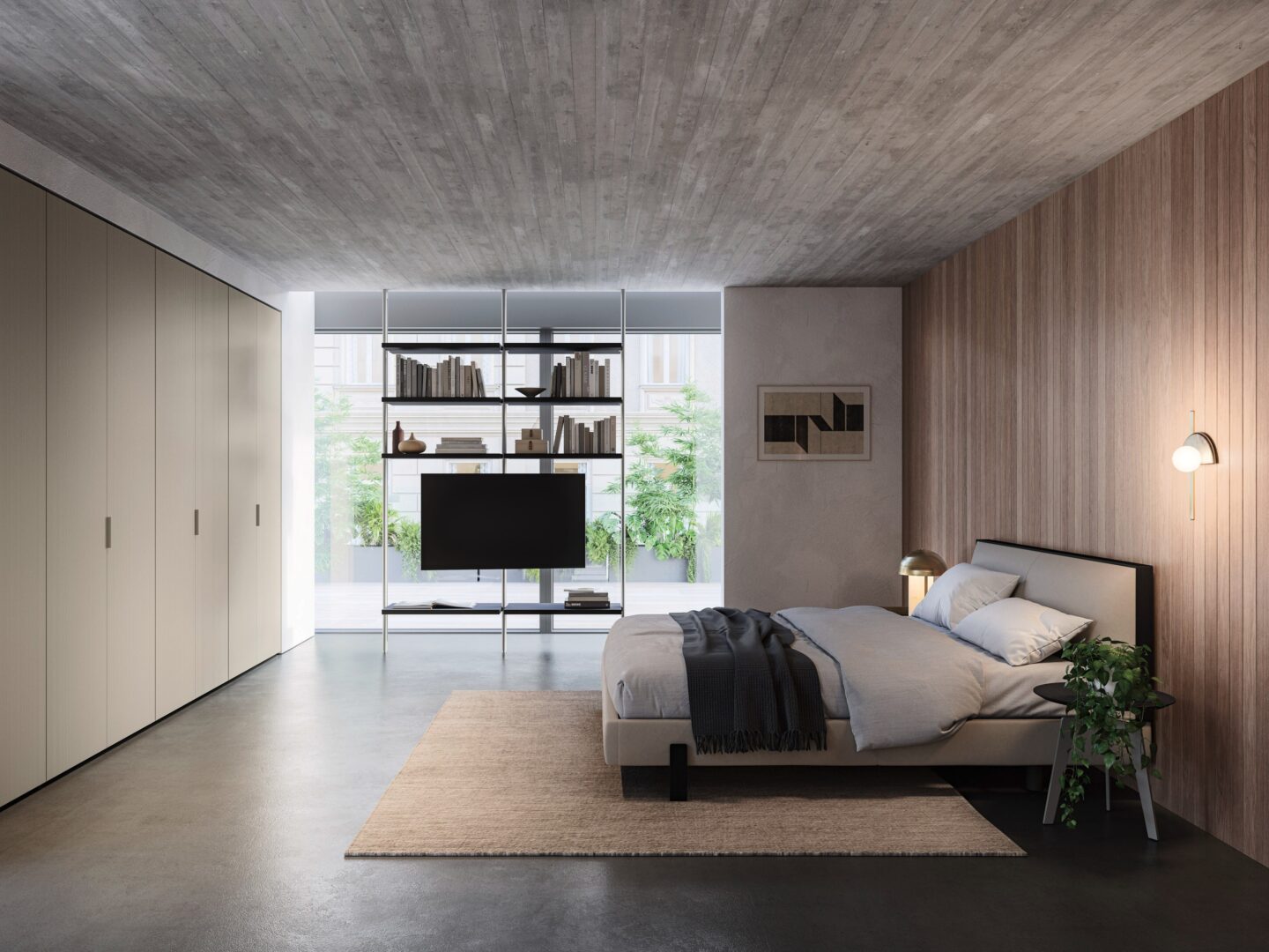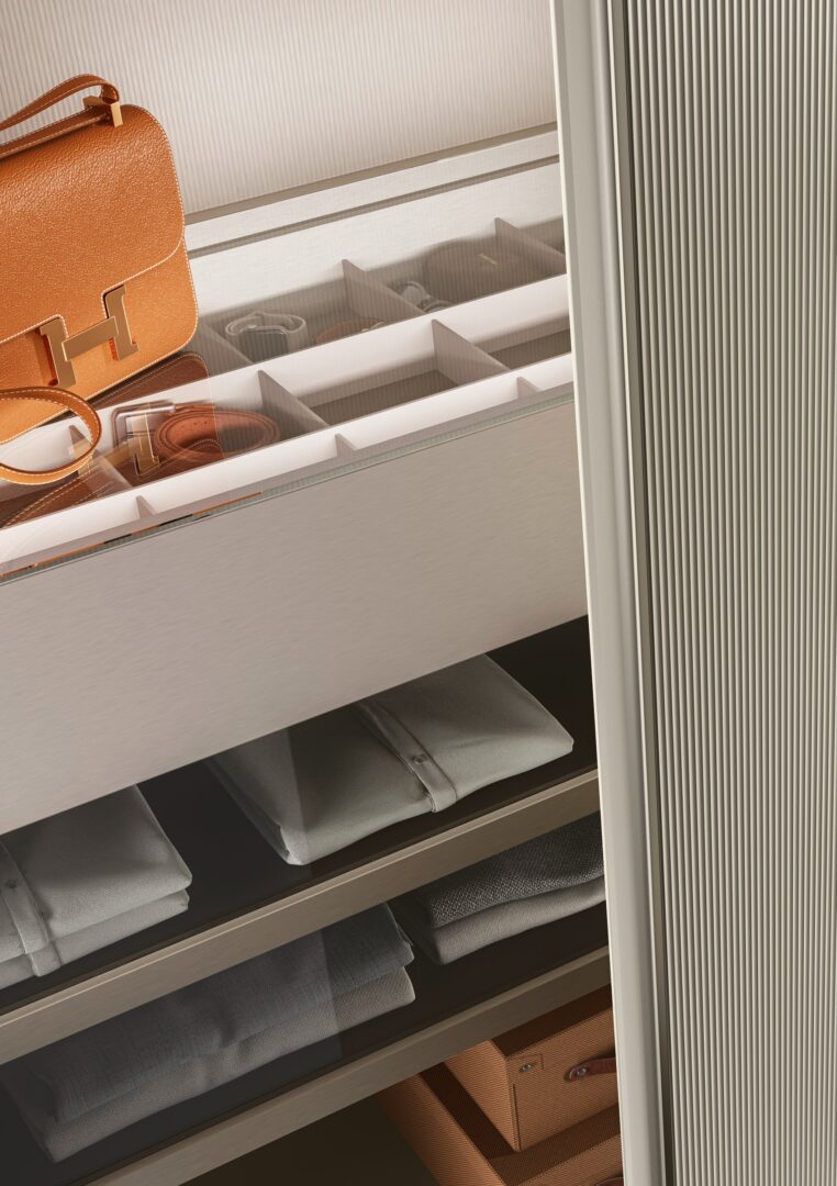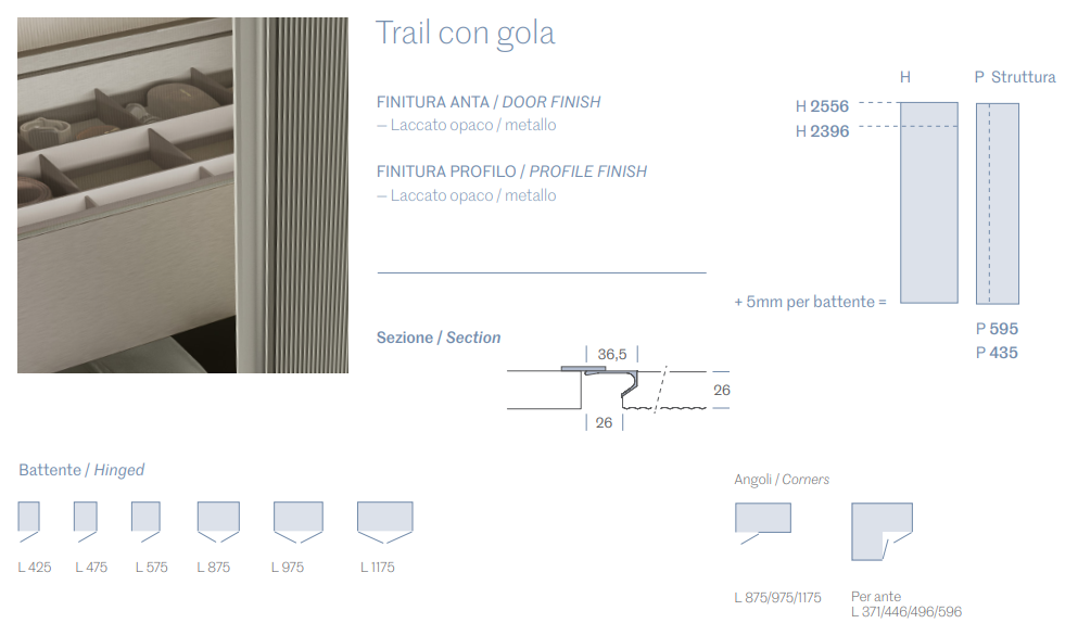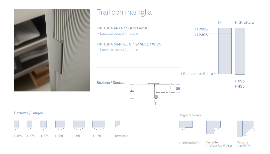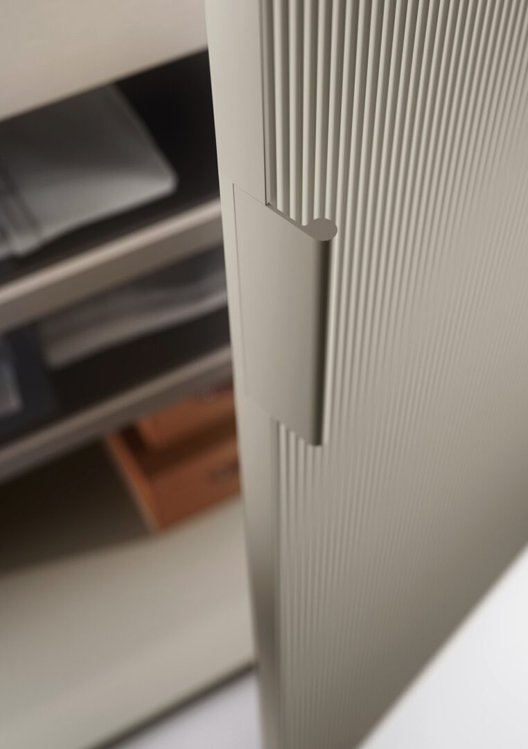 Шкаф с дверцами Trail отличается оригинальной вертикальной обработкой, доступной в лакированной или металлической отделке. Эта изысканная текстура придает шкафу сильное визуальное воздействие и особое ощущение текстуры, идеально подходящее для Moderna и Elegante. Створки могут быть настроены с помощью специальной ручки, частично утопленной, или с профилем горловины ленты, для еще более минимального и сложного эффекта.