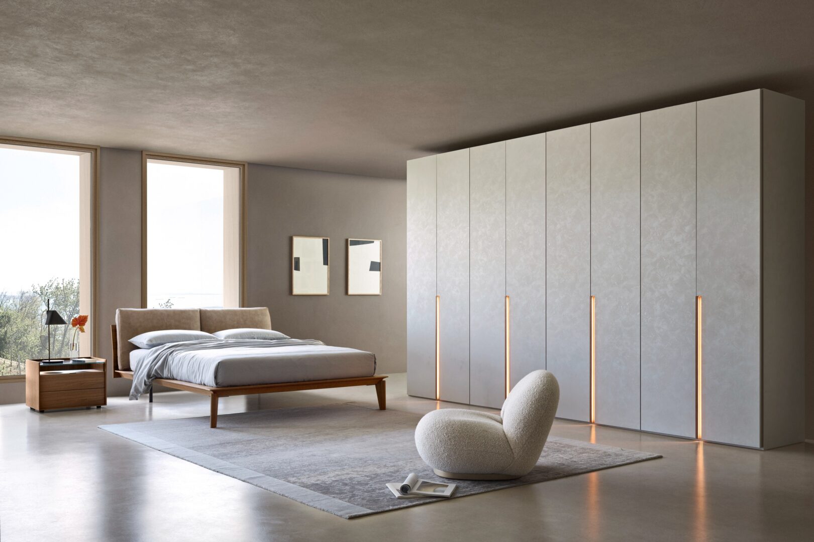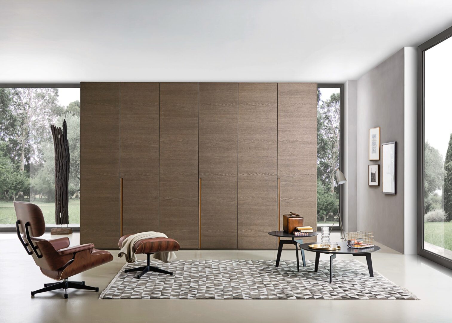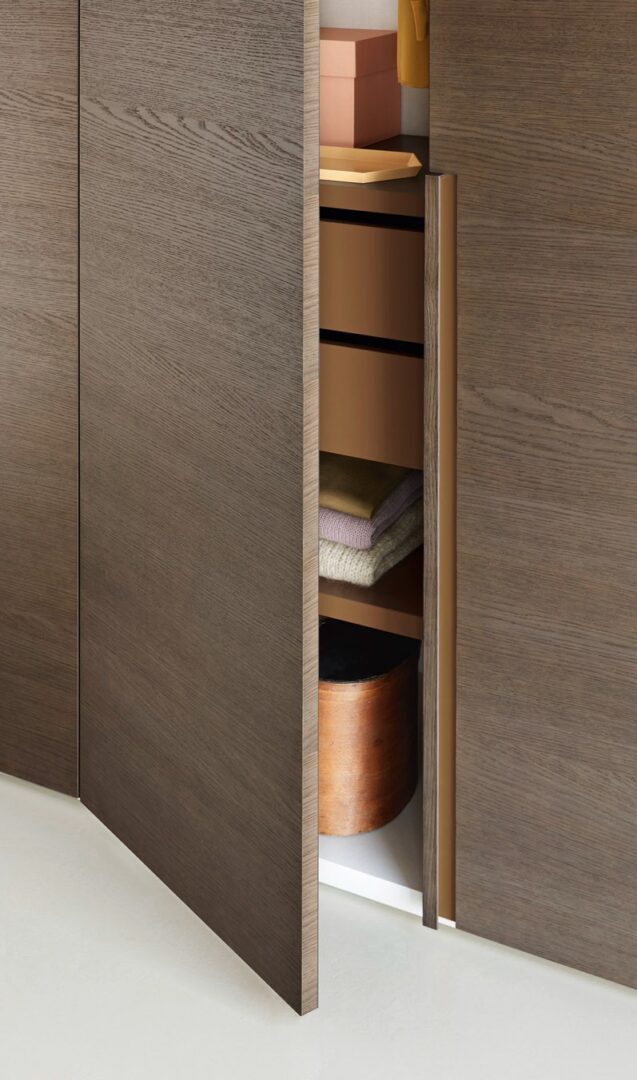 Распашной шкаф Stretch придает спальной зоне аккуратный и линейный вид, где тепло дуба сочетается с теплыми тонами и лучшей отделкой. Фактически, дизайн отличается игрой цветов и глубины, с эффектом цветового контраста между внешней поверхностью, ручкой и нижней частью полосы.
