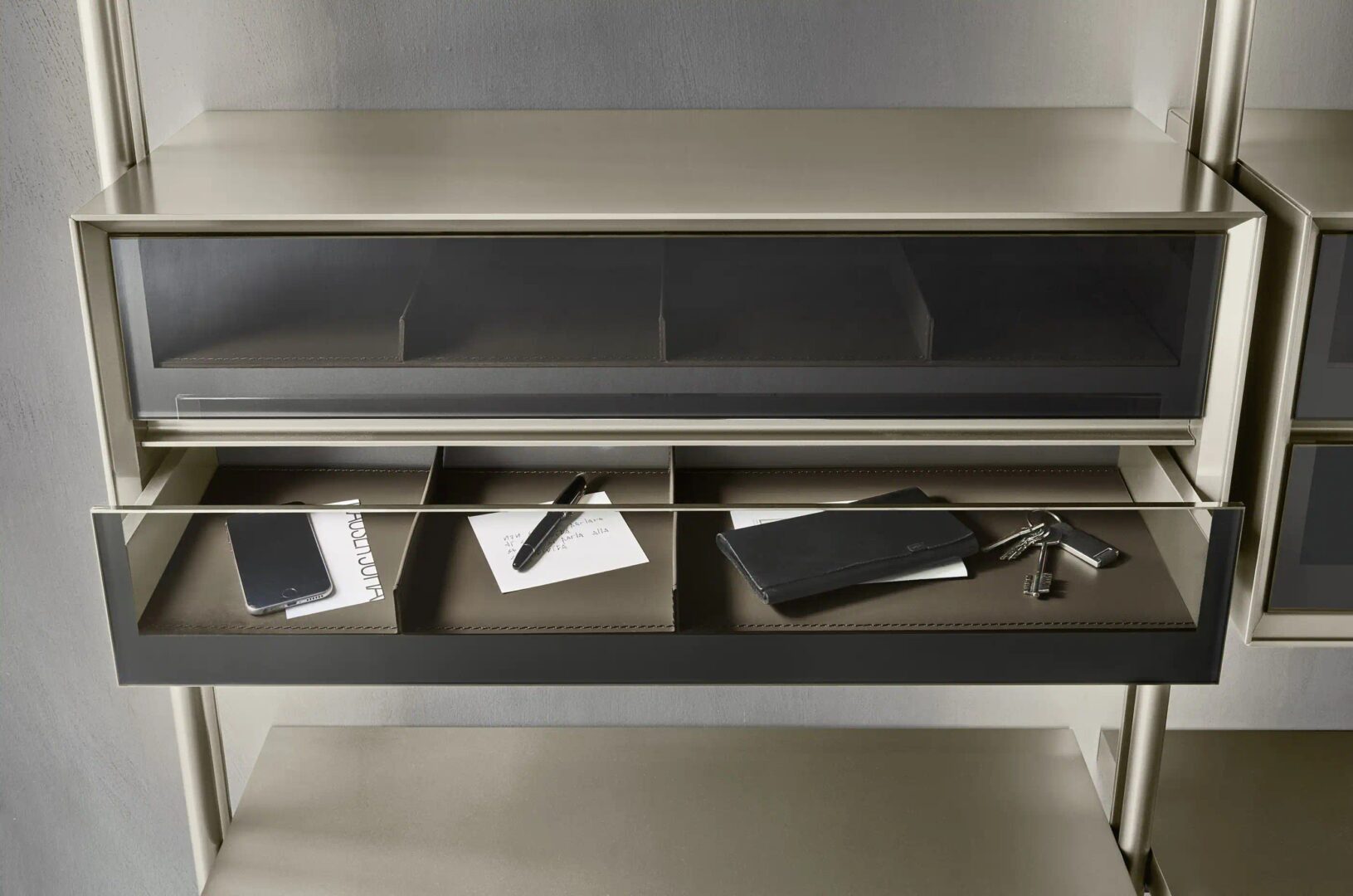 Модульные контейнеры, унаследованные от знаменитой модульной системы Domino, несут с собой контурный дизайн с корпусом и фронтами с краями под углом 45°, кроме того, они также принимают его многочисленные отделки, дополняя эстетическую гармонию Itala.
