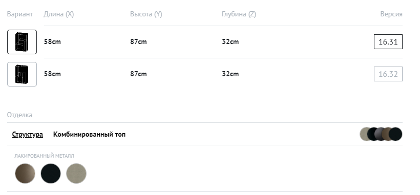 Стеллаж со структурой из лакированного стального с опциональной столещницей из стекла и опциональным цоколем из стали лакированного цвета тёмной латуни или чёрного цвета.