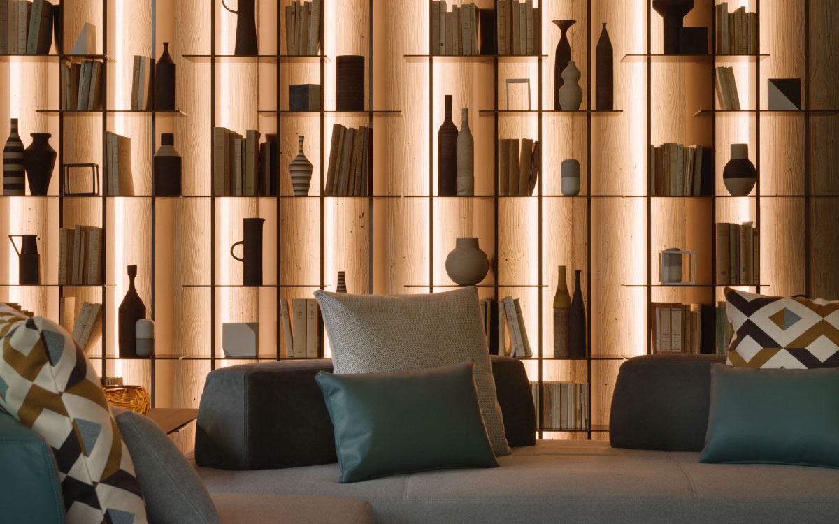 Книжный шкаф CCLight — прекрасный пример того, как свет может придать помещению легкость, атмосферу и нотку волшебства. В первую и третью стойки вмонтированы светодиоды, которые при включении рисуют яркие формы и рассеивают свет, эквивалентный освещению торшера. Тонкая и элегантная конструкция из алюминиевого профиля сочетается с большой функциональностью. Книжный шкаф предлагается в различных вариантах высоты и цвета: белый, черный, матовый обожженный, анодная бронза, матовый бежевый, оксид, оксид серебра и пустынный камень.