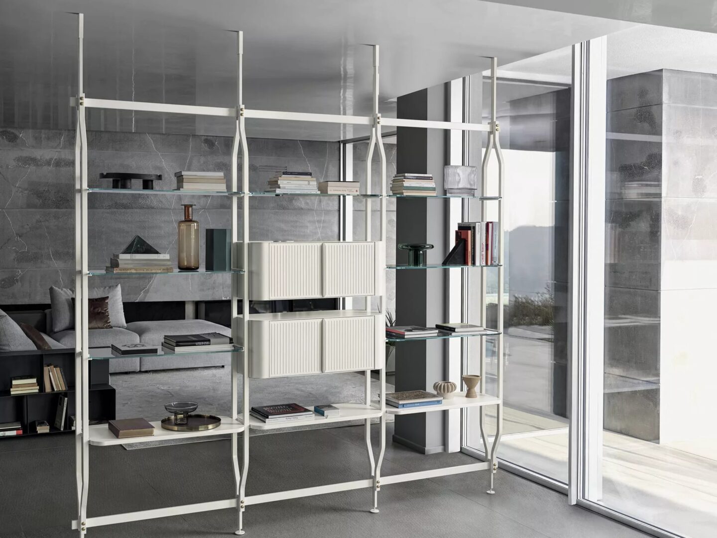 Книжный cтеллаж и дополнительный модуль с креплением к потолку и к стене, предназначен для размещения 4/8/12/16/20 полок и / или дополнительных ящиков. Структура и декоративные детали из лакированной стали.