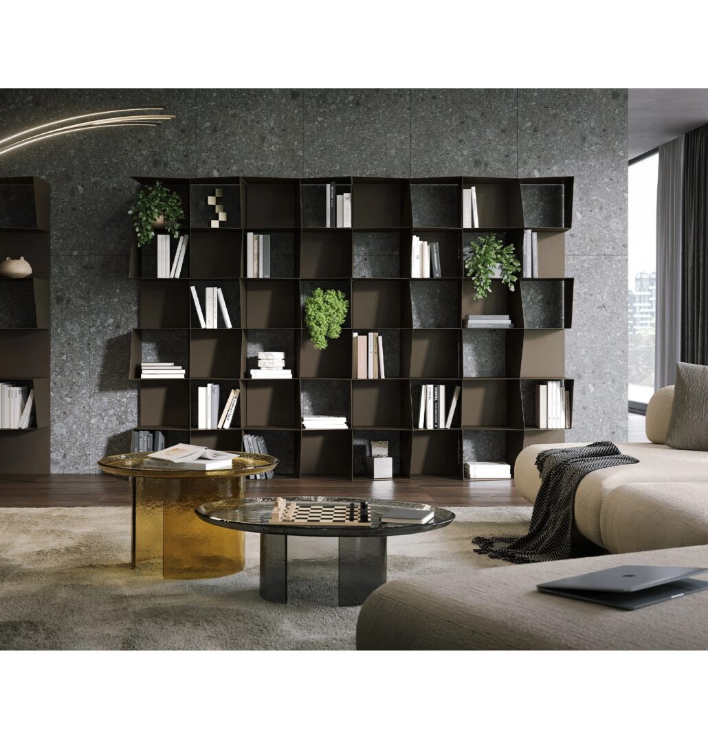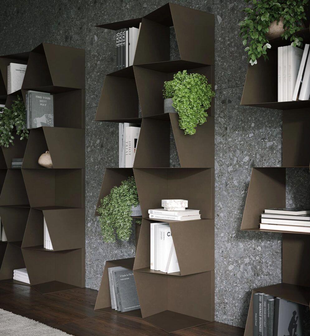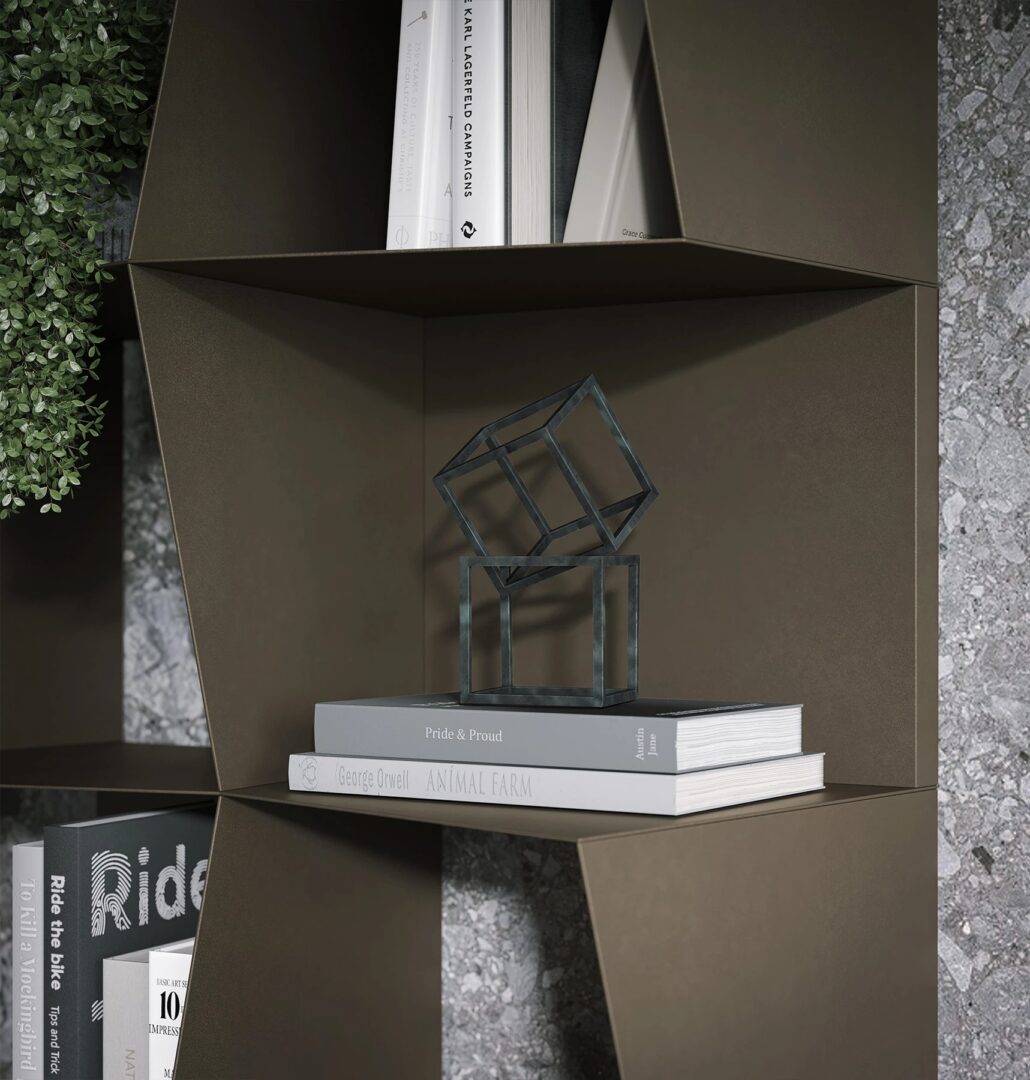 Книжный шкаф с простыми формами, который передает ощущение динамизма, делая пространство более увлекательным.