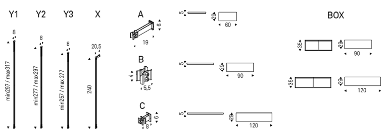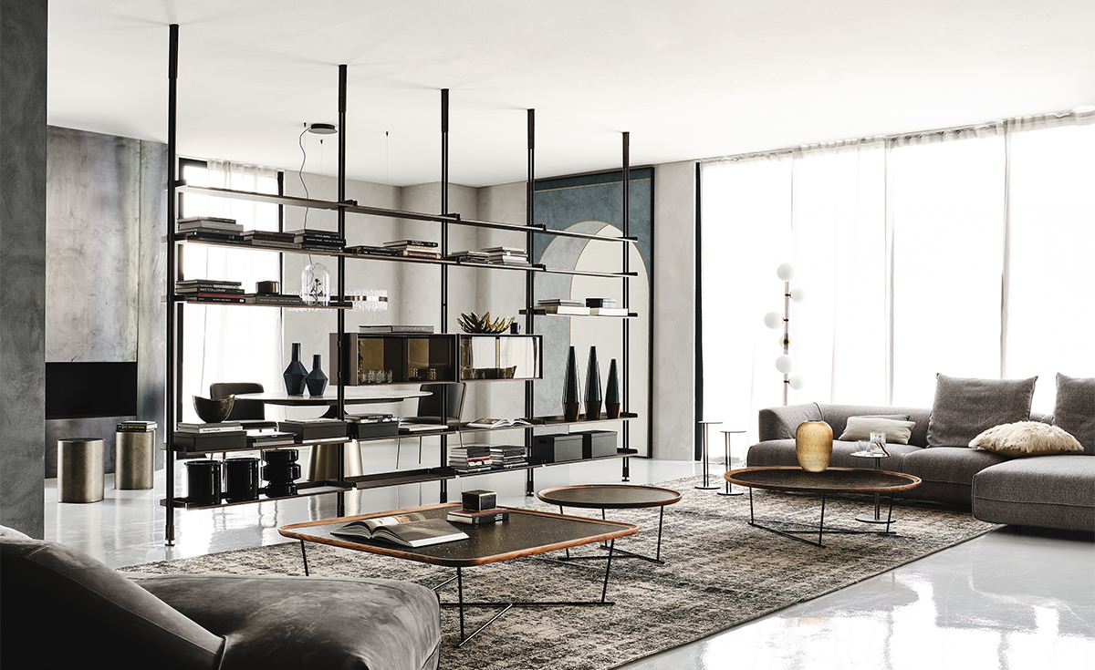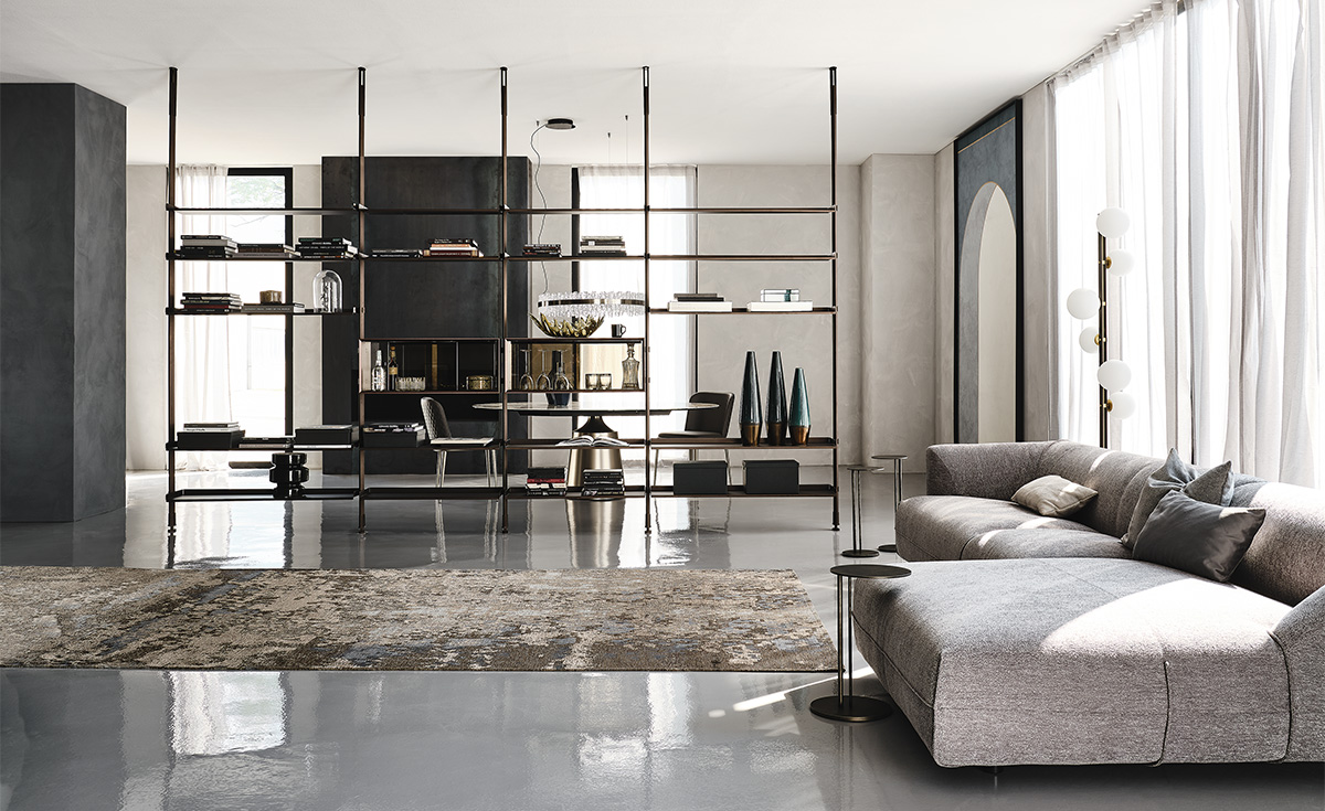 Металлическая конструкция с регулируемыми полками и ящиками позволяет создавать индивидуальные композиции для любого пространства. Возможны различные варианты размещения: у стены, в центре комнаты или в углу благодаря настенному и потолочному креплению. Идеально подходит в качестве стильной перегородки для зонирования открытых помещений.
