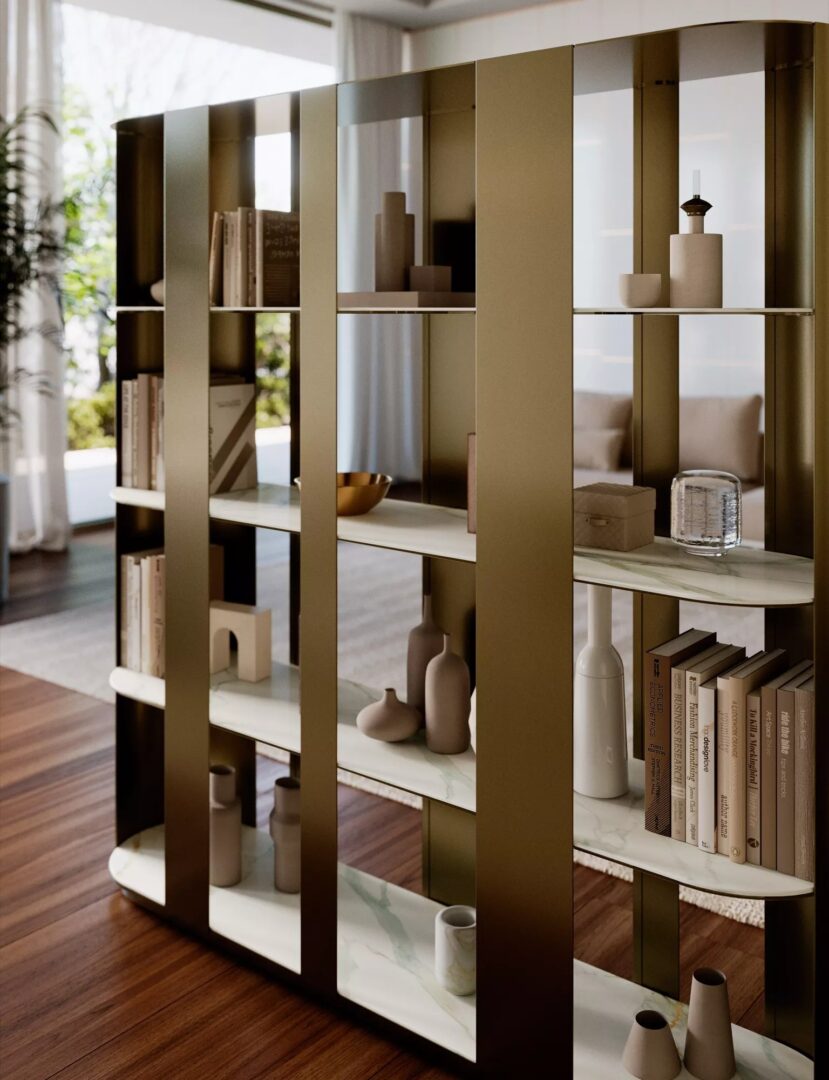 Cтеллаж Helena — это домашняя микроархитектура: объект, который разделяет, соединяет и рассказывает. Его овальное, органичное основание разрушает жёсткость традиционного книжного шкафа. Смещённые несущие колонны, расположенные в элегантной игре заполненного и пустого между передней и задней сторонами, создают перспективы, визуальные фильтры и кулисы. Одни предметы видны, другие скрыты — не случайно, а по замыслу. Взгляд направляется через переменную геометрию, изменяющуюся в зависимости от положения наблюдателя и света, играющего на полках. Идеален как скульптурная перегородка в напольной версии или как функциональный элемент, структурирующий пространство, в настенной версии.