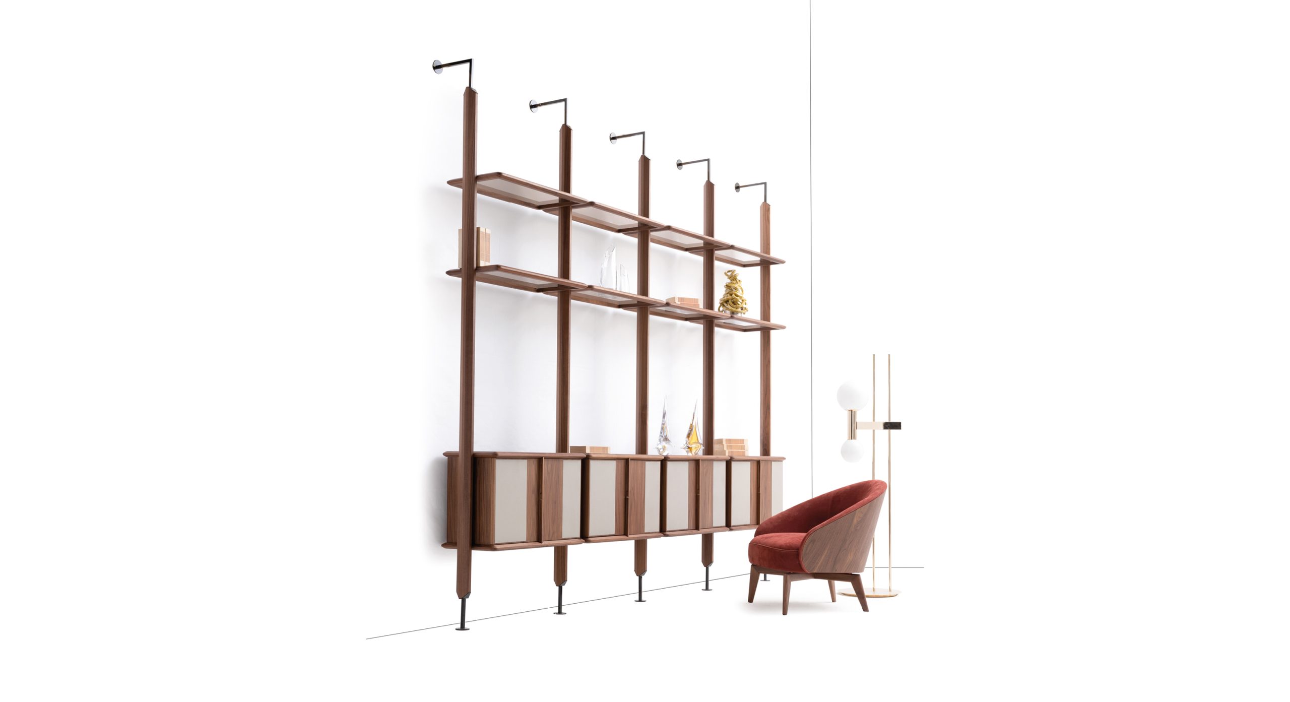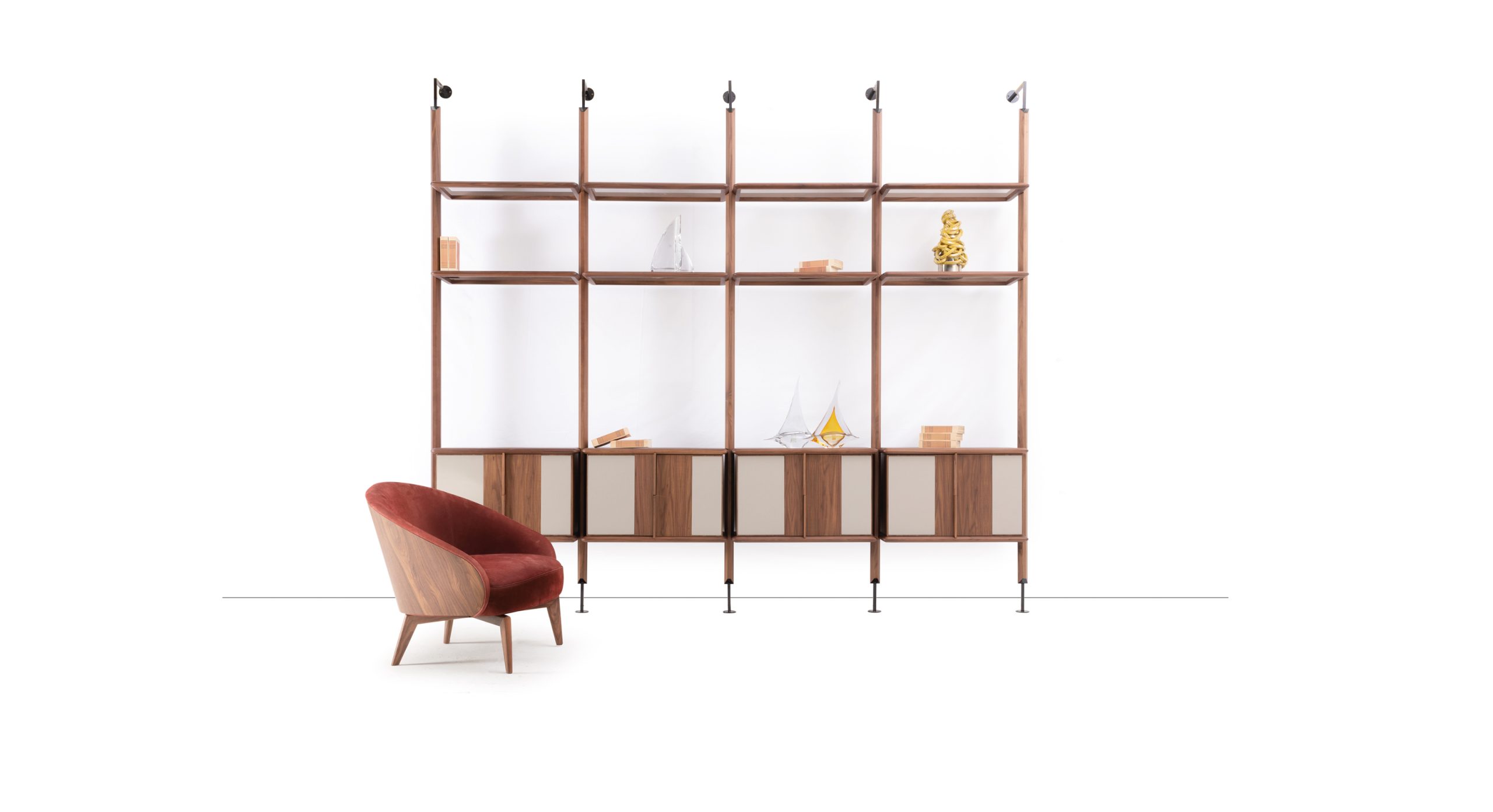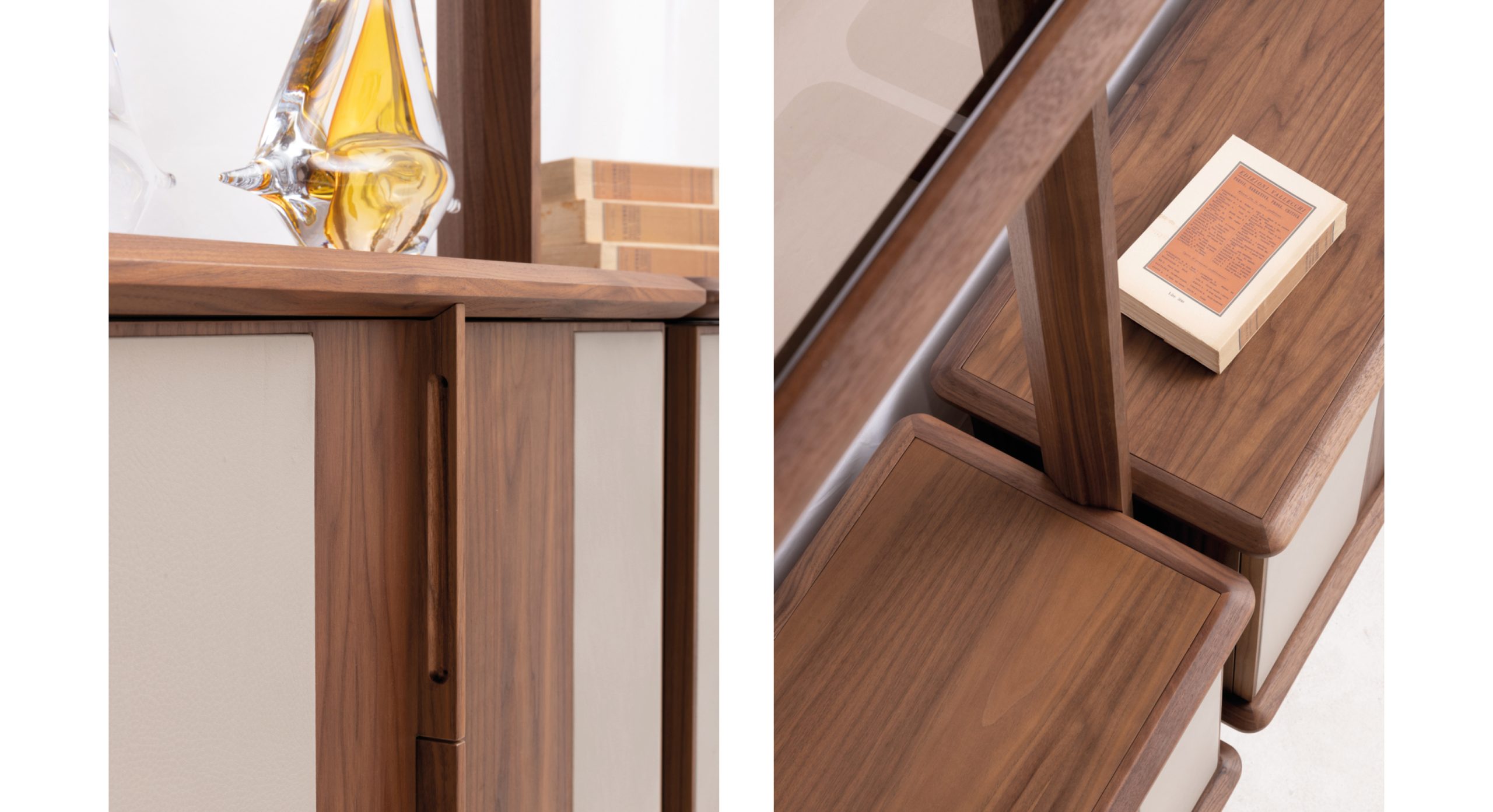 Конструкция: Основная рама из массива американского ореха с ножками и настенными креплениями из черного никелированного металла. Полки с каркасом из массива американского ореха доступны в вариантах A-B-C A: Полки из американского ореха. B: Полки с рисунком кожи. C: Полки с бронзовым стеклом. Модель Larry подготовлена и предназначена для настенного или потолочного монтажа.