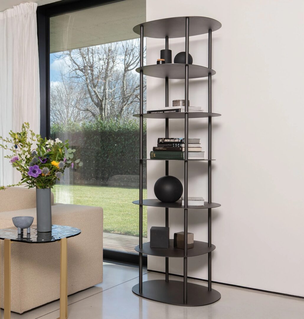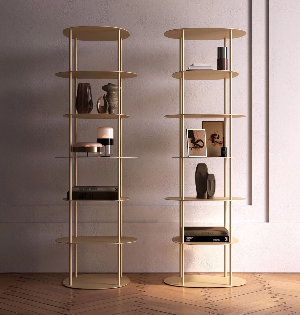 Отдельно стоящий книжный шкаф с семью опорными полками и отделкой угольно-серым, матовым золотом или каменной бронзой. Элегантное сочетание изящных изгибов столешниц и модульной конструкции являются характерными чертами oasi, изысканного элемента мебели с чистым современным дизайном.