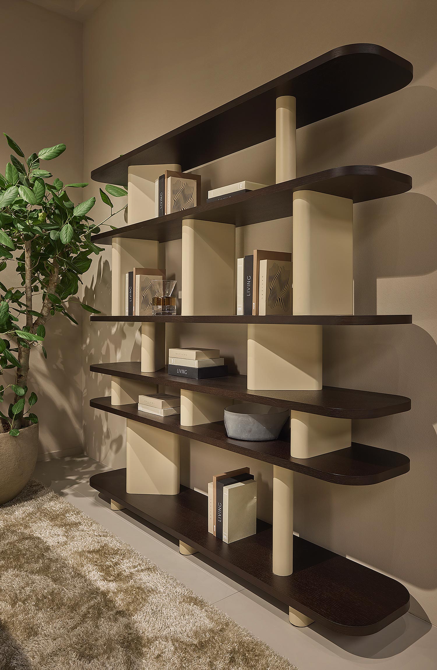 Особенность модели — возможность персонализации: более 15 вариантов отделки деревянных полок, а также выбор между глянцевым, матовым, металлическим или оловянным покрытием вертикальных стоек. Итальянское качество и внимание к деталям делают этот стеллаж стильным и функциональным элементом декора.