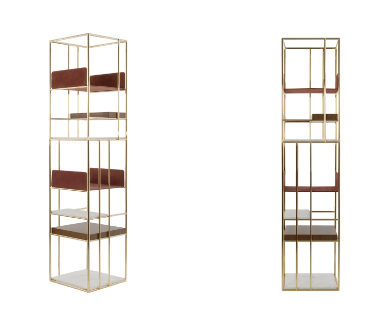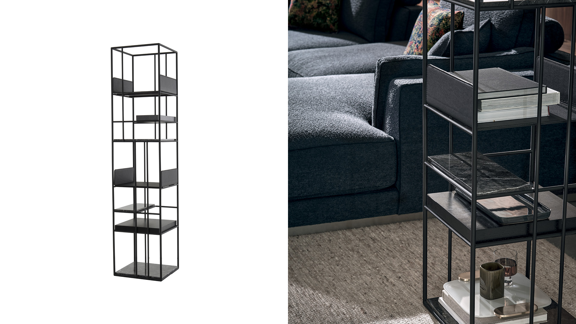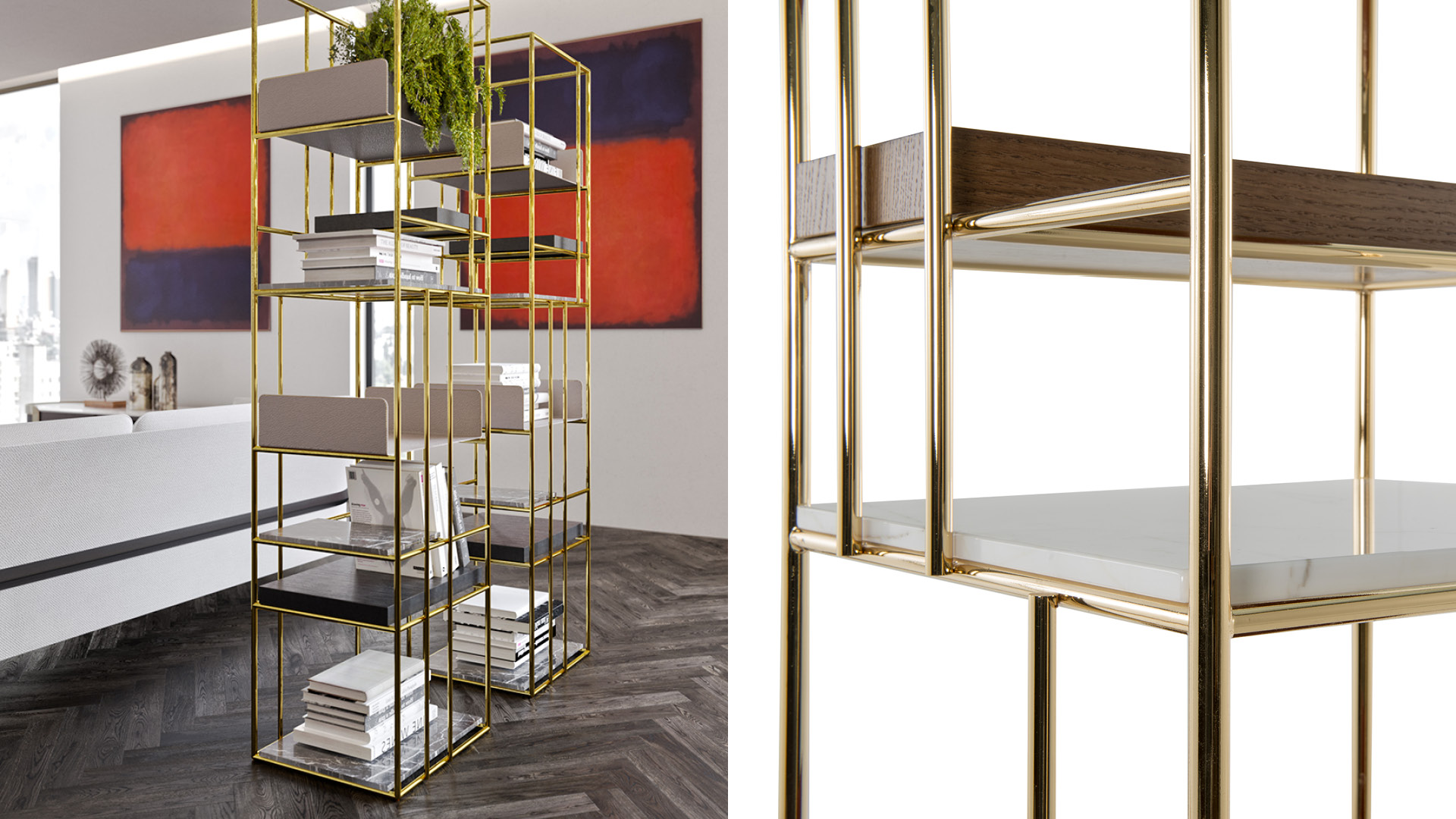 Металлический книжный шкаф Taylor отличается легкими линиями и геометрической структурой. Его уникальность подчеркивается увлекательными и элегантными сочетаниями материалов для полок, которые могут быть выполнены из дерева, мрамора или обиты тонкой кожей.