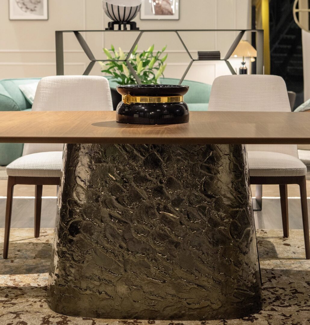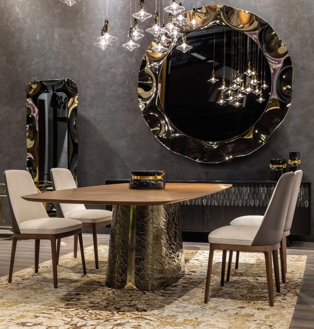 Каждая комната возрождает необычайную красоту с Adone, стол, который сочетает в себе скульптурную эстетику с драгоценной отделкой ручной работы: Adone удивляет смелым сочетанием естественности деревянного верха и драгоценности основания из изогнутого стекла bocciardato и Retro посеребренный, в бронзовых или черных тонах.