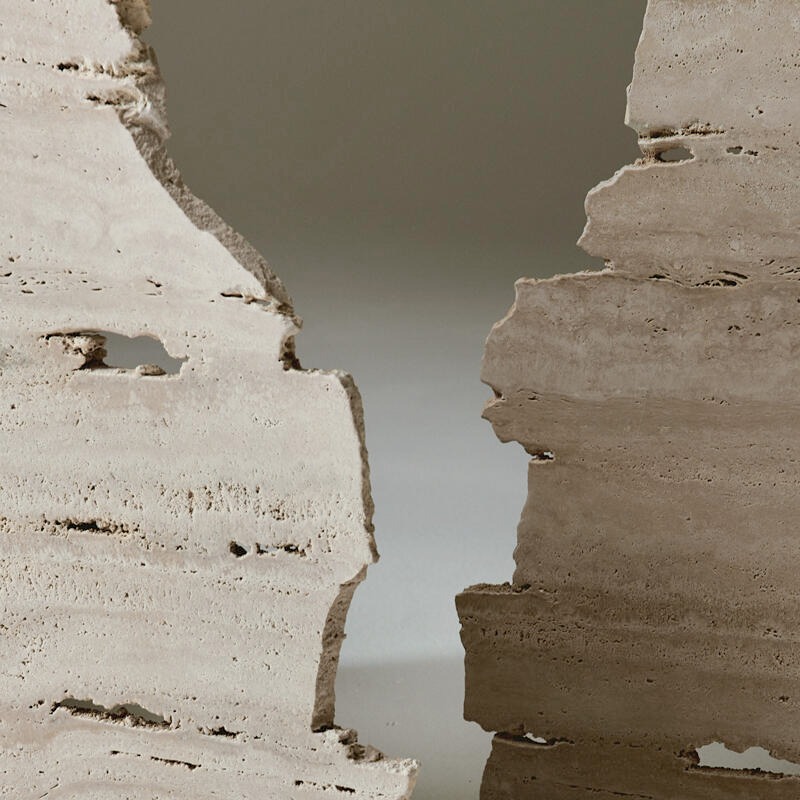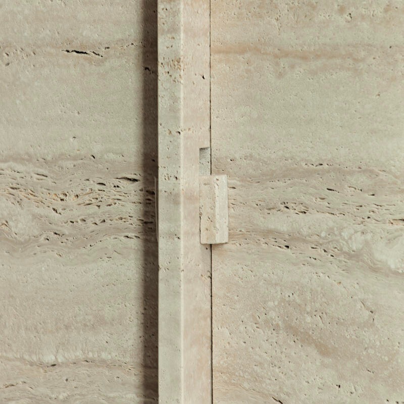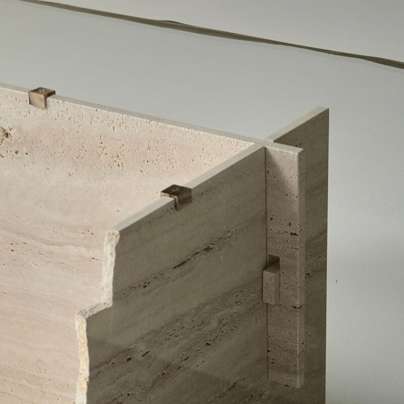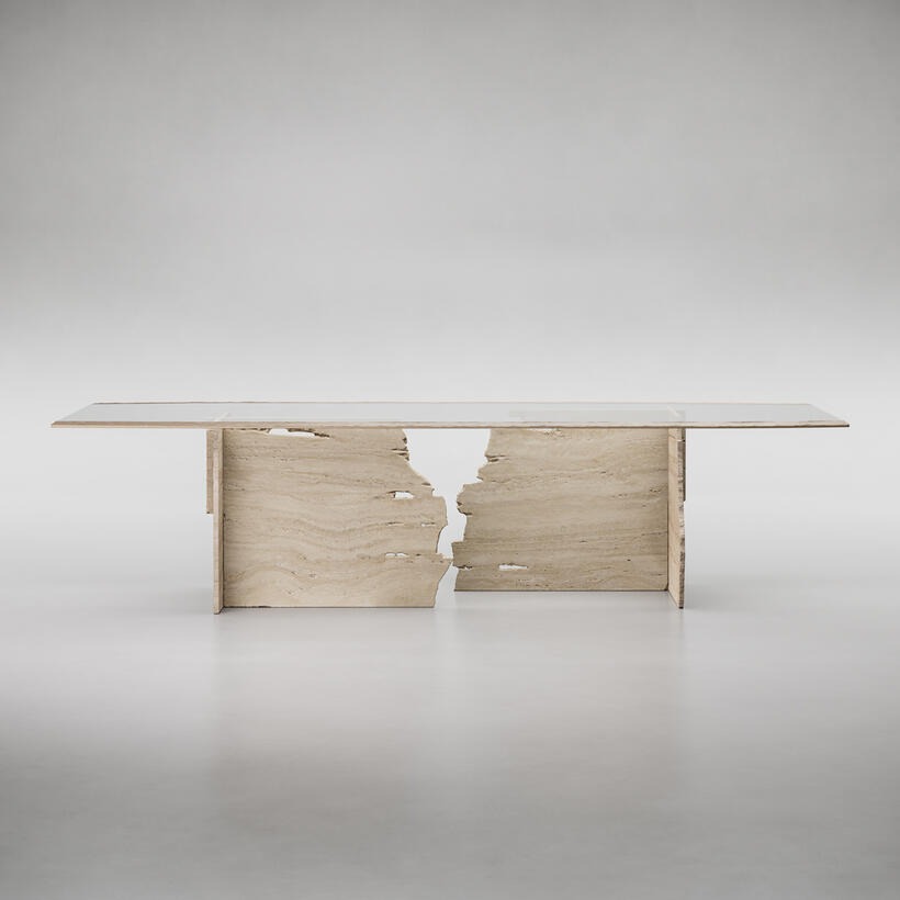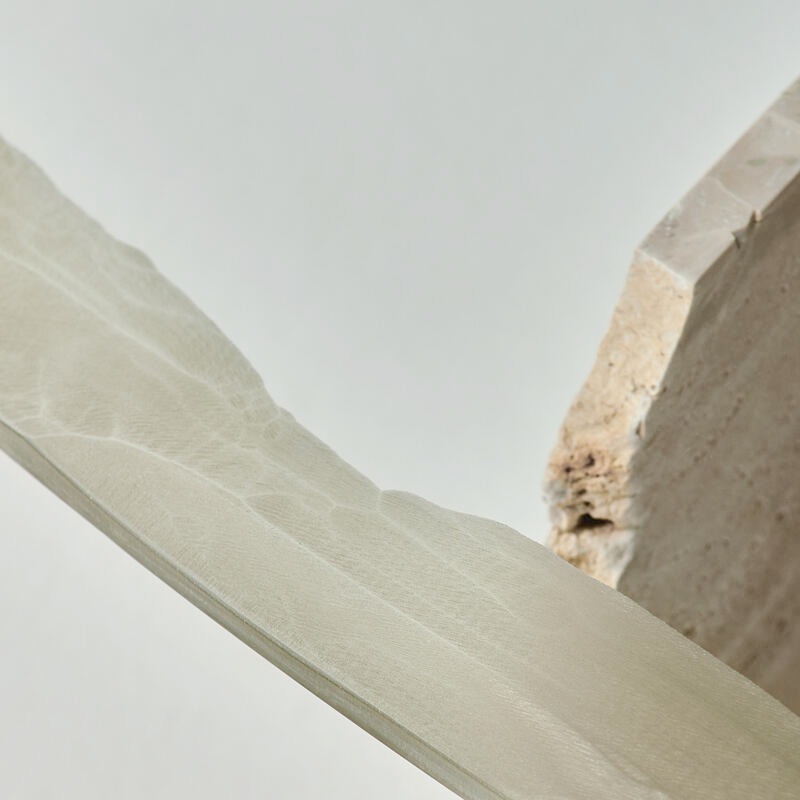 Столешница из сверхпрозрачного стекла, украшенная матовой отделкой. Структура — травертиновый мрамор.