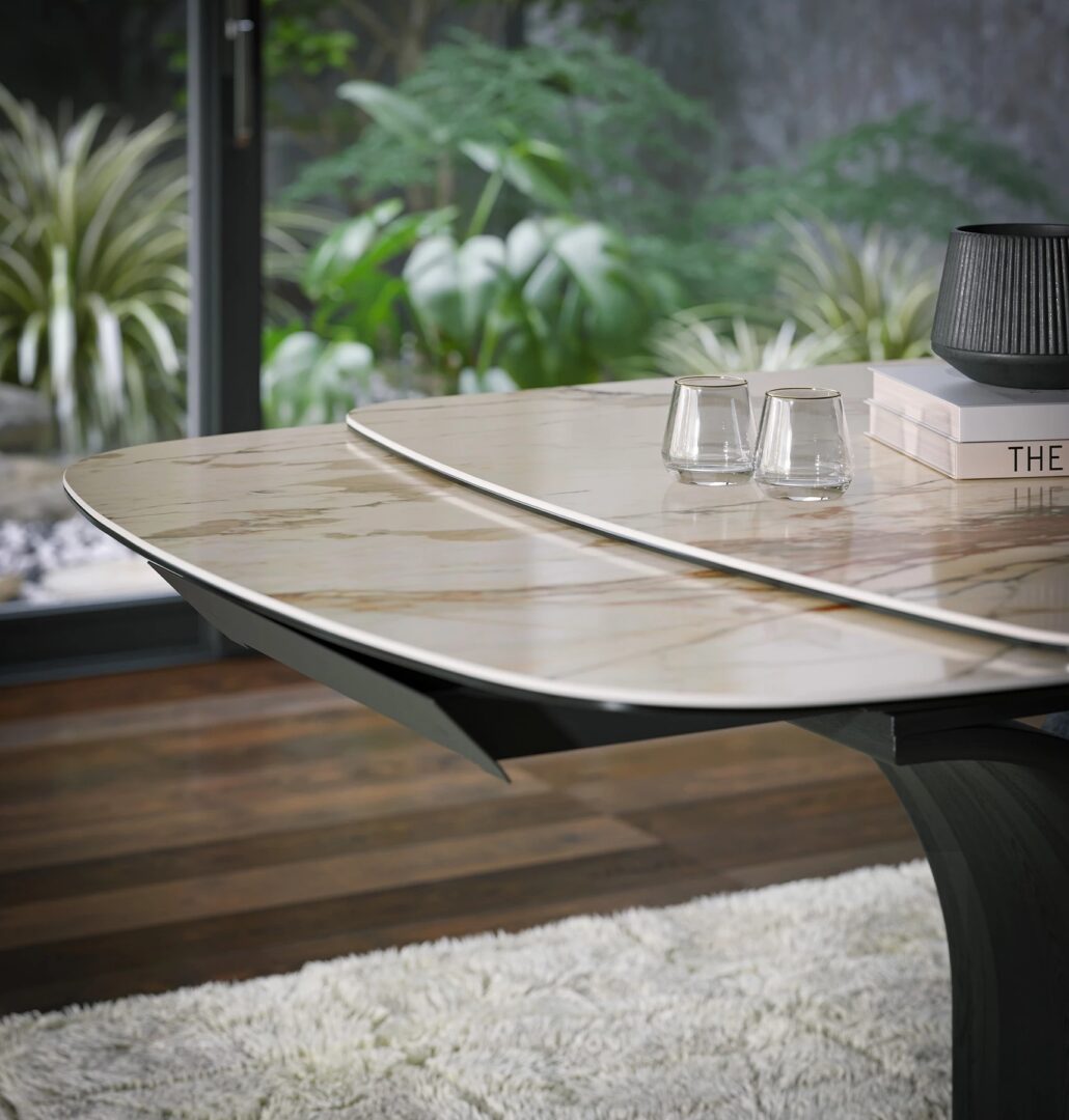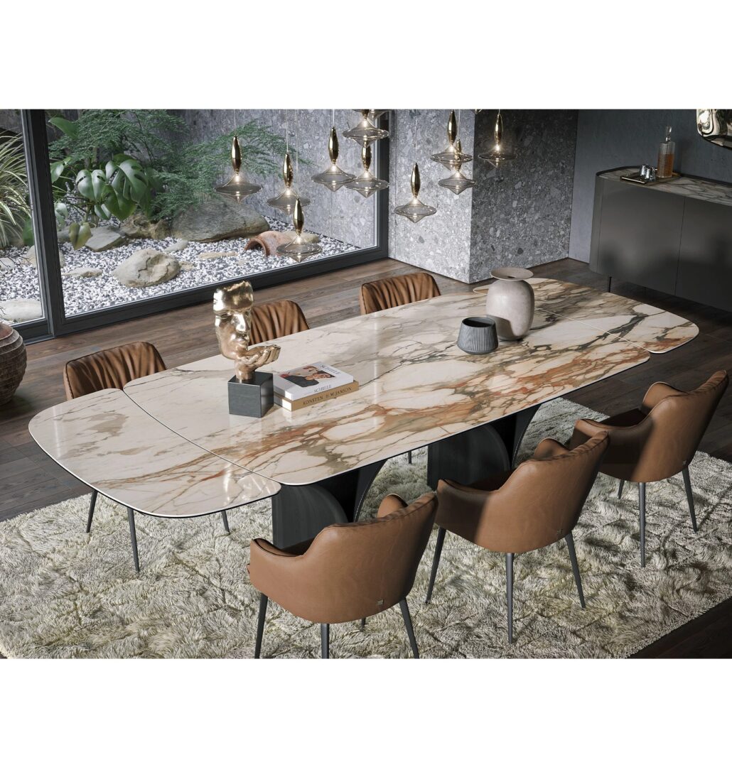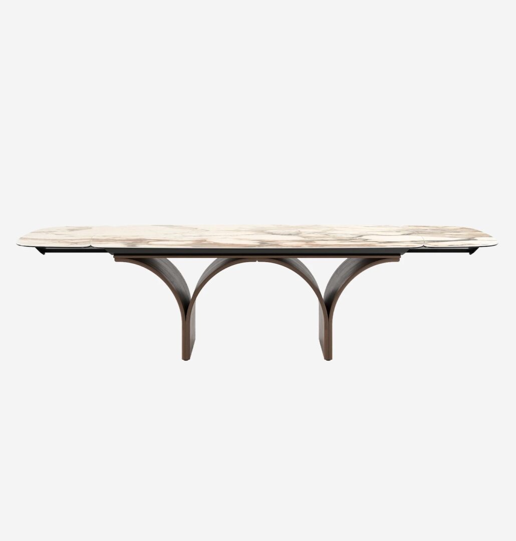 Стол Arco переосмысливает классическую архитектуру с термокурвированным деревянным основанием, вдохновленным круглой аркой. Он сочетает в себе традиции и современность, сочетая прочность и легкость в элегантном дизайне. Столешница, доступная в керамике с эффектом мрамора и другой тонкой отделке, повышает ее престиж. Оснащен системой растяжения, арка адаптируется с универсальностью, став центром вневременных моментов обмена.