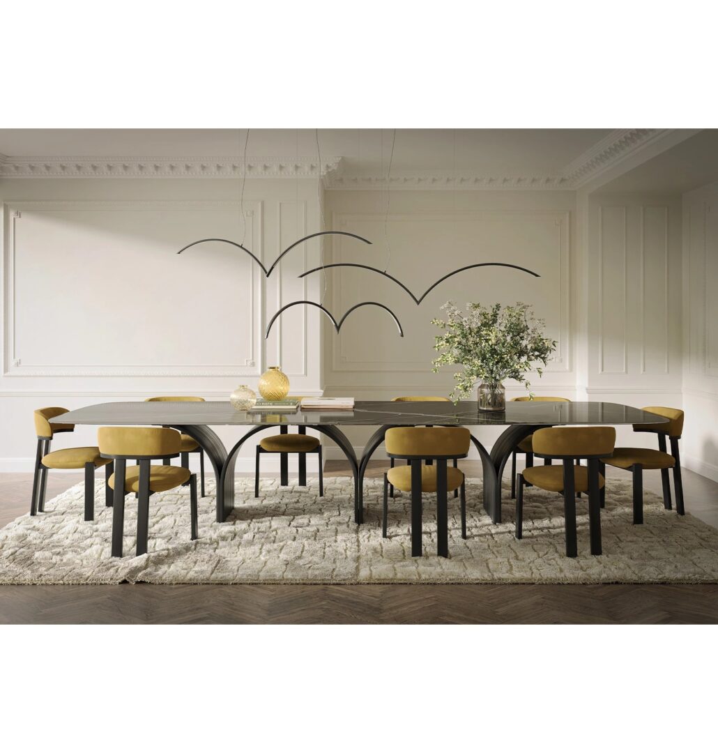 Стол Arco возрождается в макси-версии. Две элегантные арки с деревянным покрытием поддерживают большую печатную стеклянную столешницу, которая подчеркивает текстуру драгоценной отделки на выбор между Crystal Calacatta и Calacatta Black.