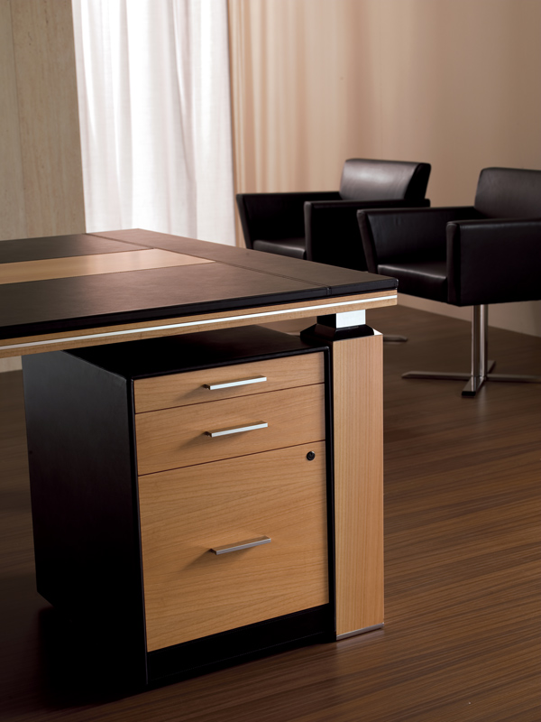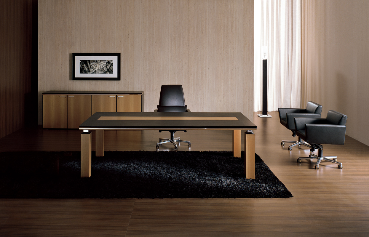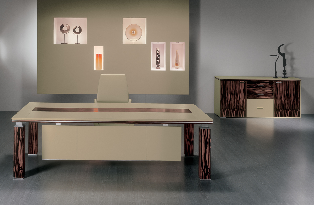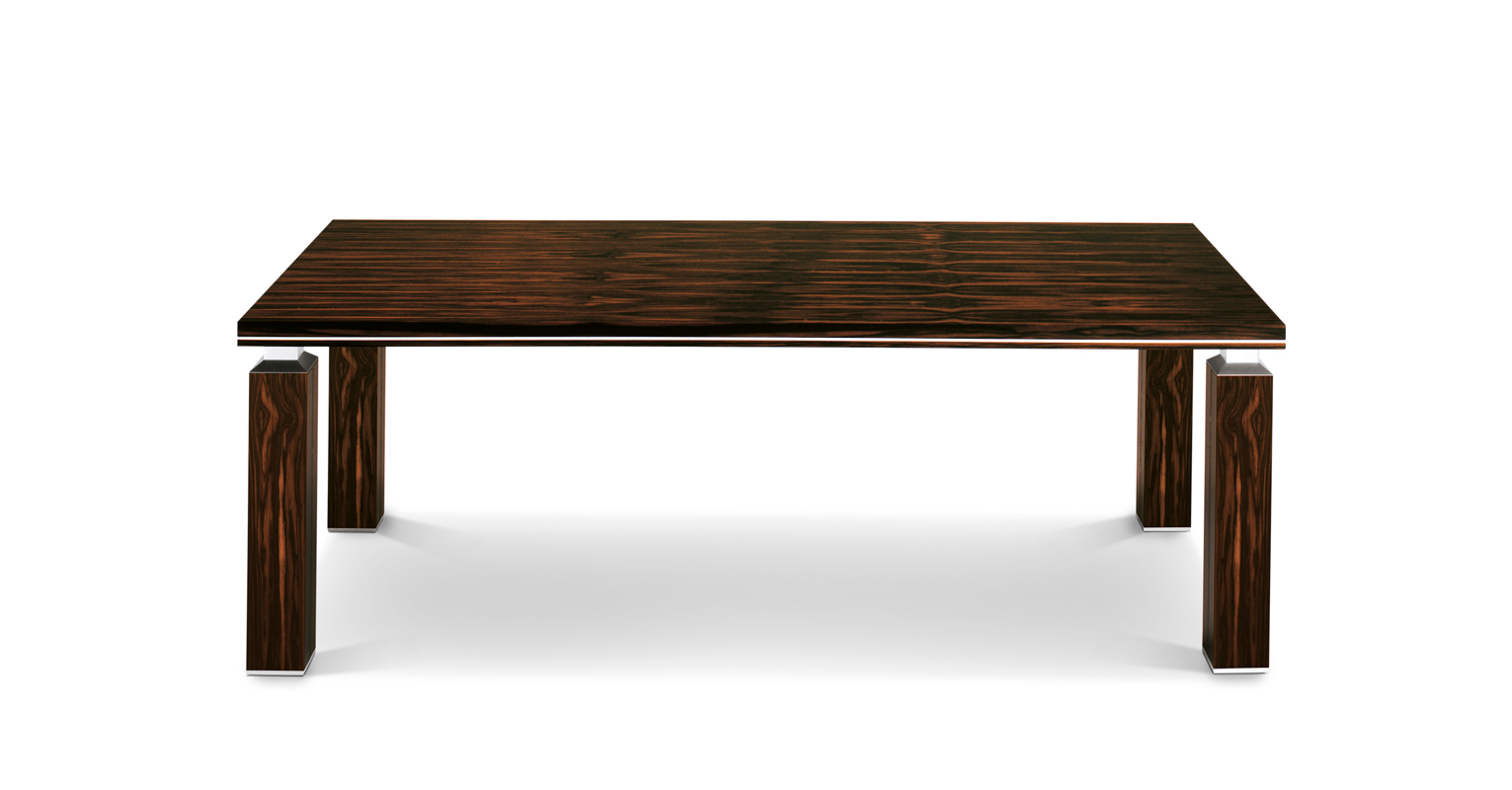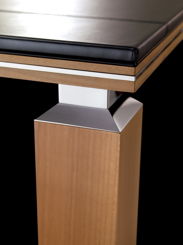 Столешница установлена на четырех стойках, поддерживаемых квадратными ножками. Симметричный рисунок металлических распорных элементов представляет собой геометрический рисунок головы барана, а вершины, обозначенные по краям стальным профилем, относятся к горизонтальным полосам, символизирующим классическую архитектуру.
