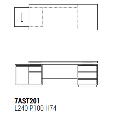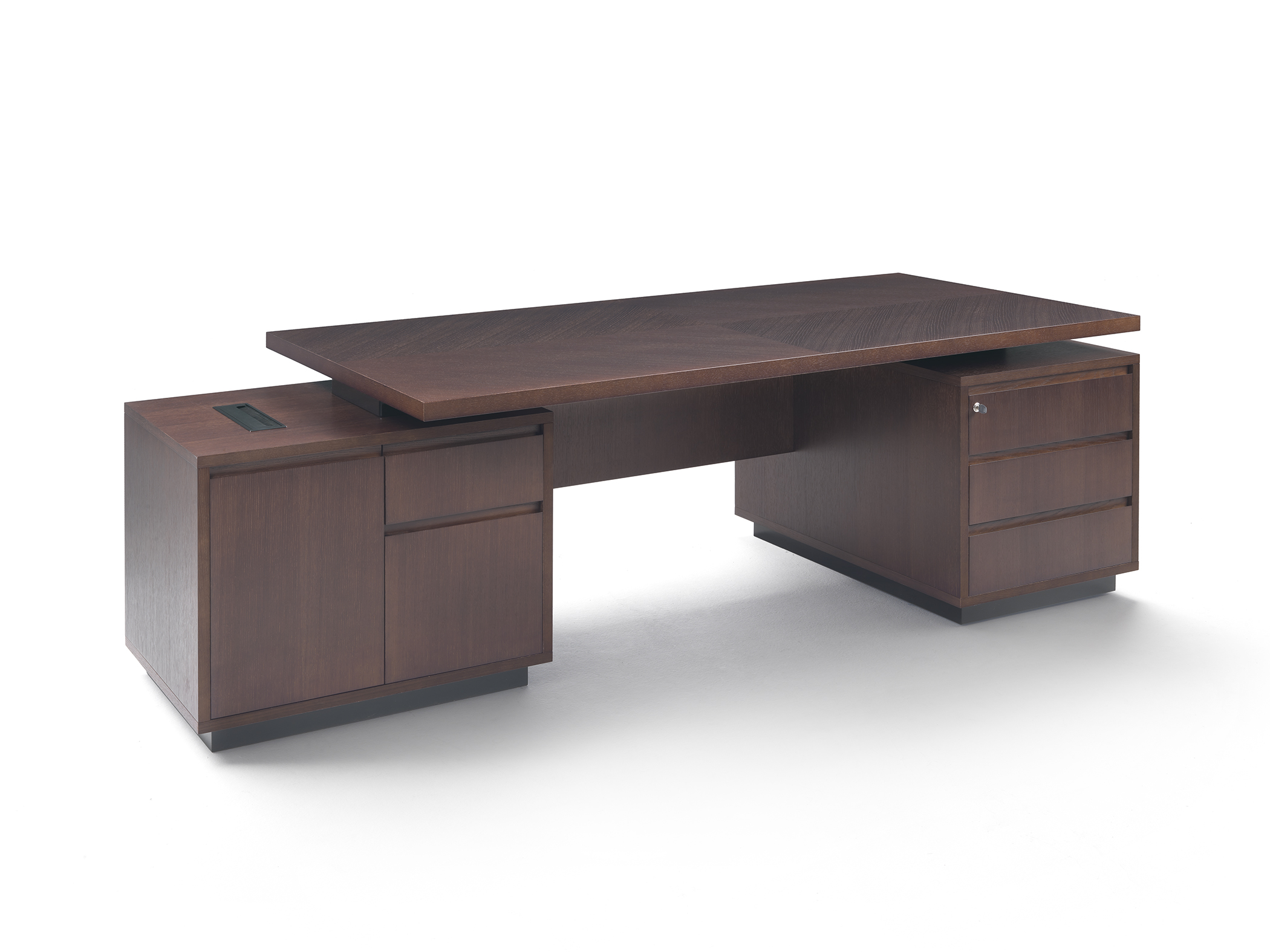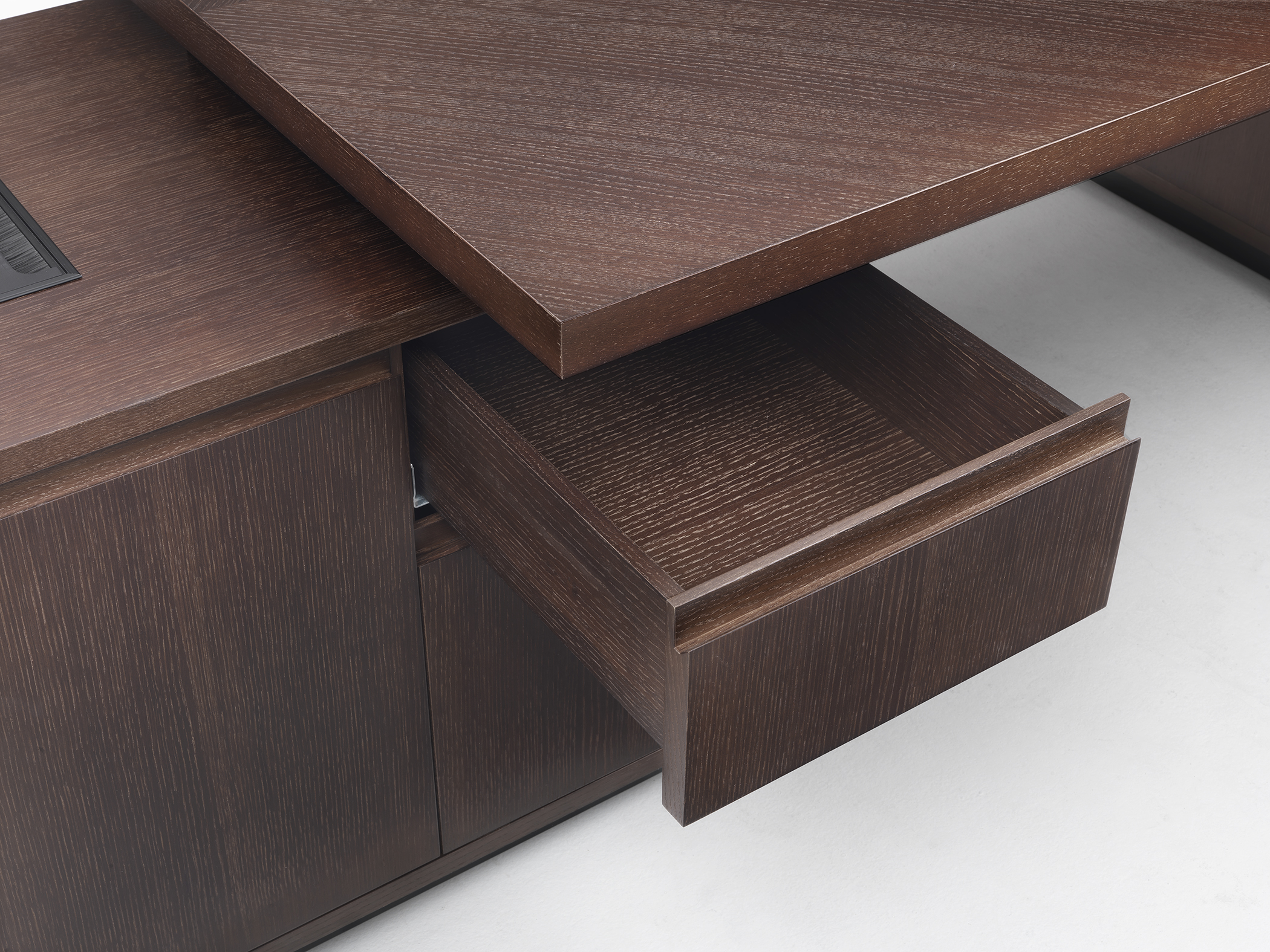 Столешница и передняя панель отделаны шпоном ценных пород дерева под углом 45°, что подчеркивает мастерство итальянских мебельщиков. Встроенные системы хранения и кабельные вводы обеспечивают удобство использования, сохраняя рабочее место аккуратным.
