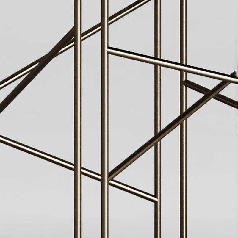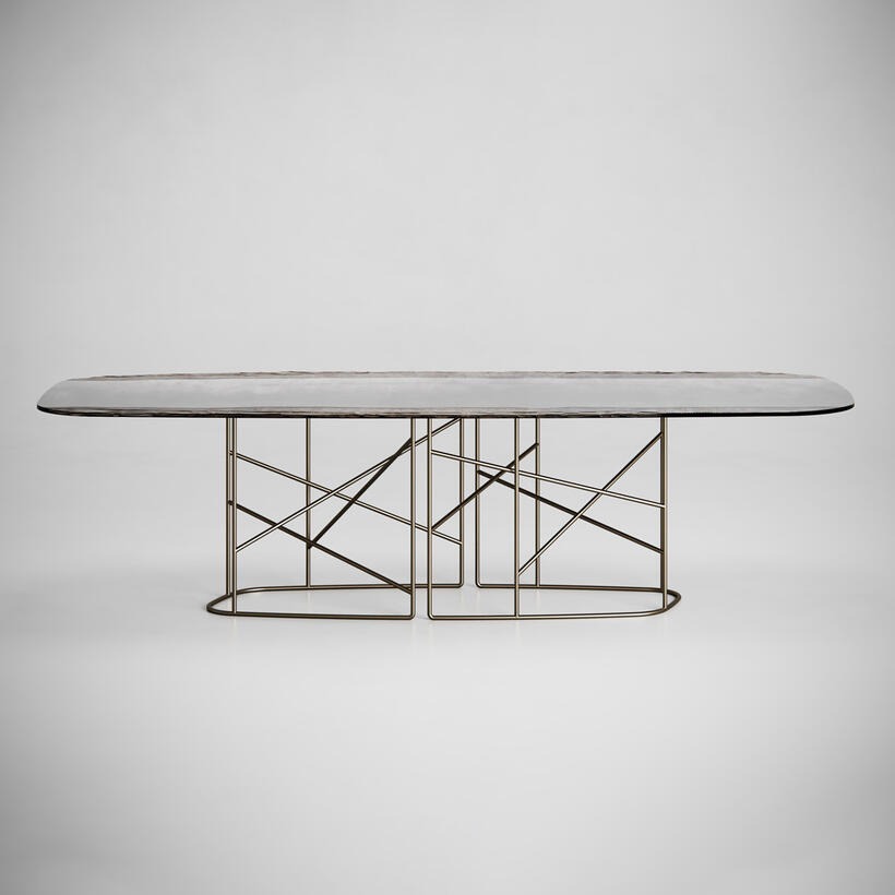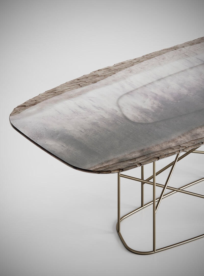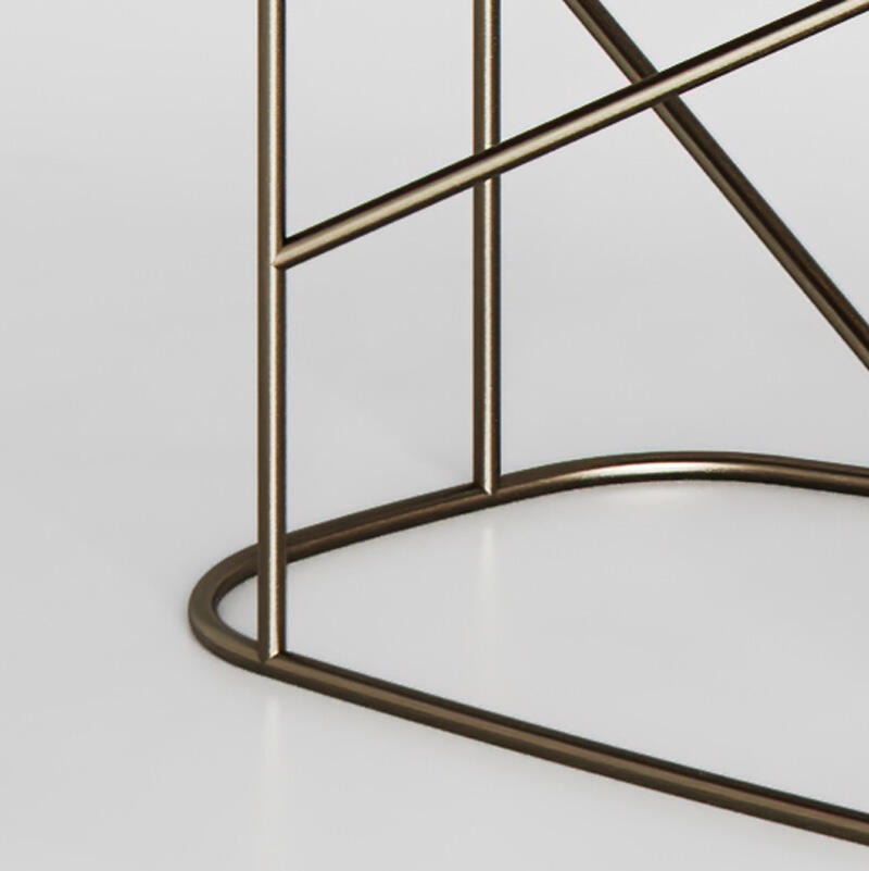 Металлическая конструкция с матовой отделкой из полированной латуни. Стеклянная столешница толщиной 10 мм украшена элементами Roddi и Neive.