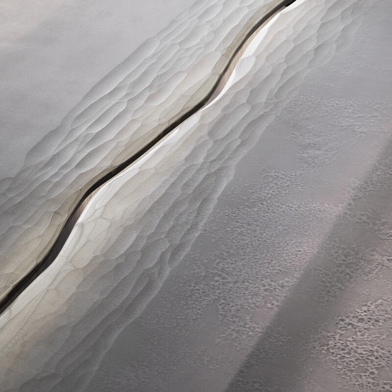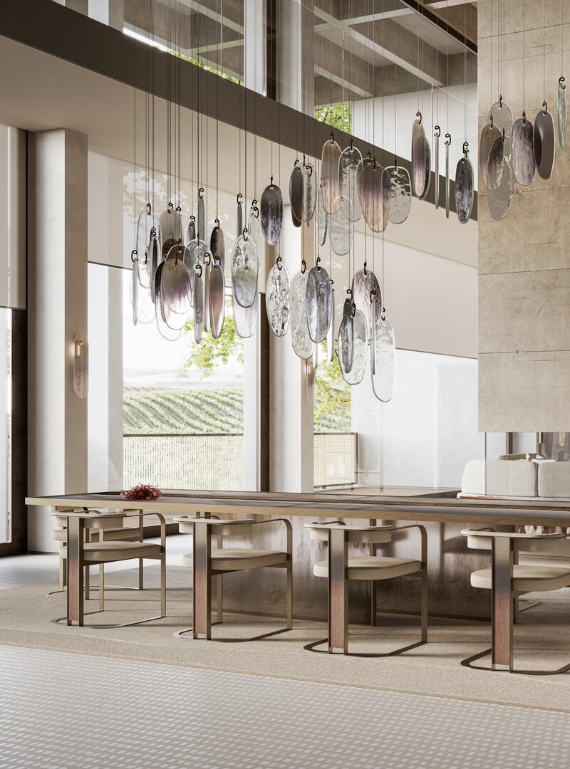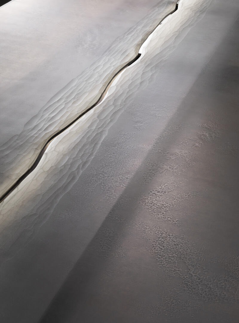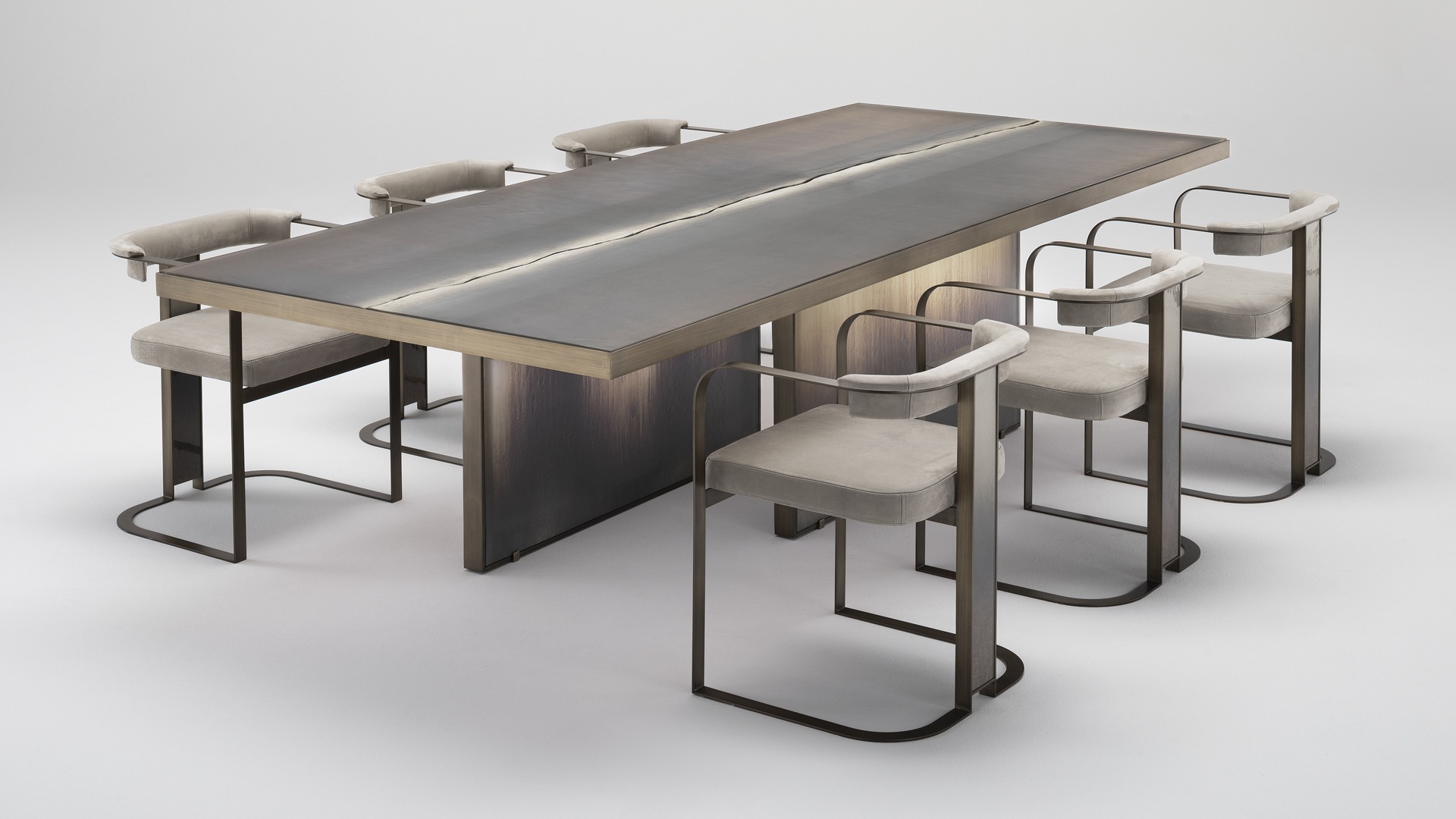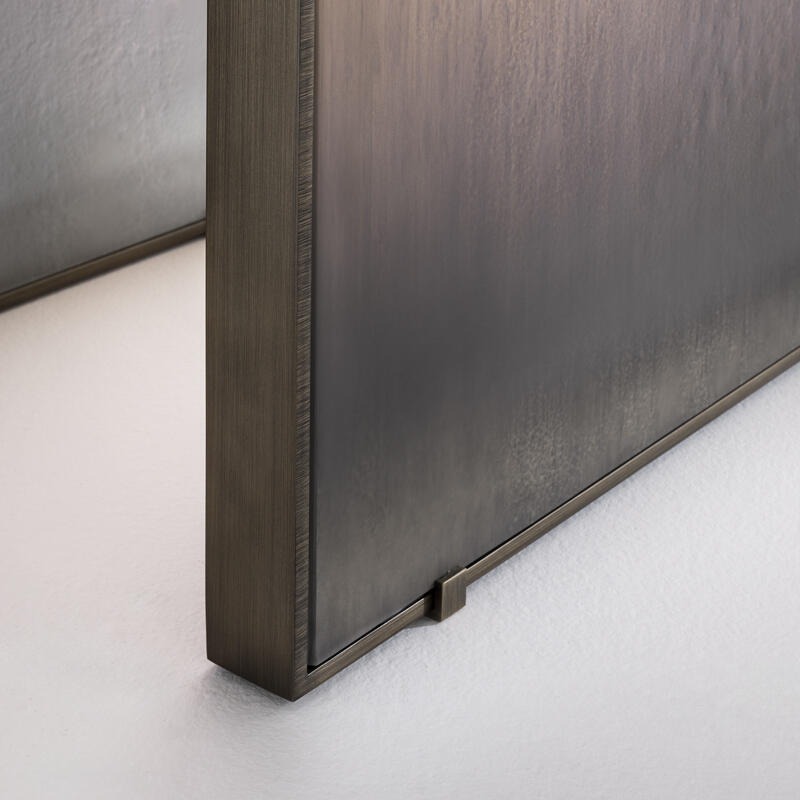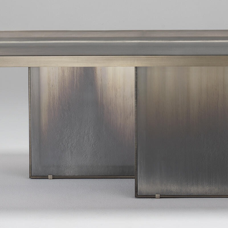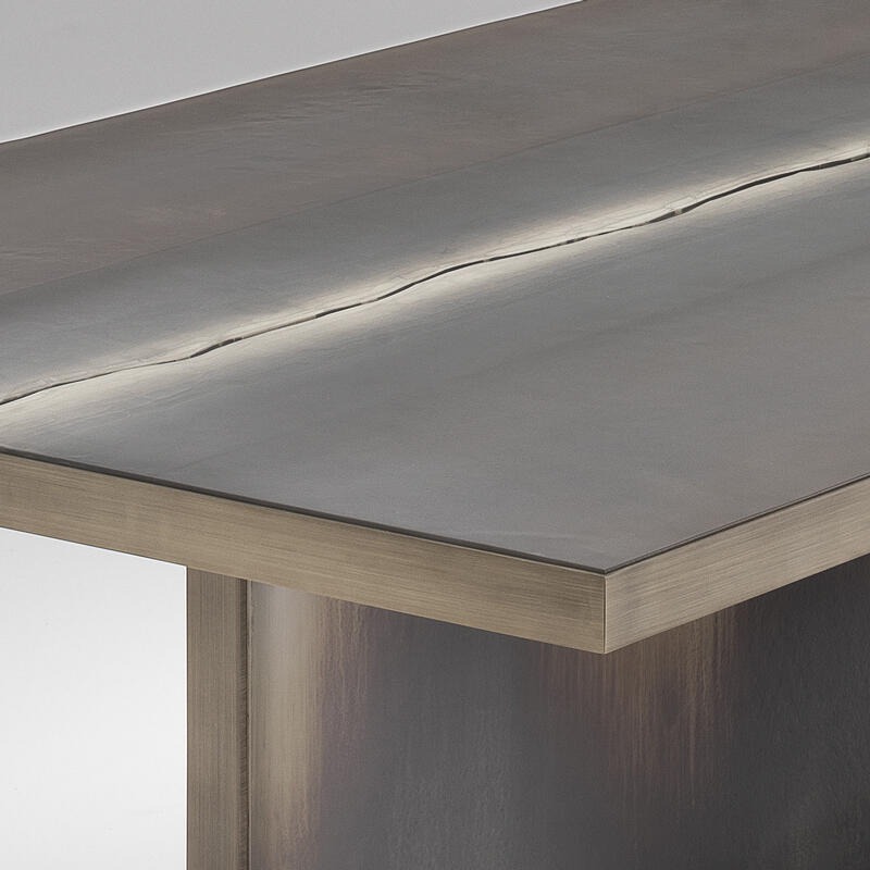 Металлическая конструкция с матовой отделкой из полированной латуни. Стеклянная столешница толщиной 10 мм, разделенная на две части, украшена отделкой Roddi.