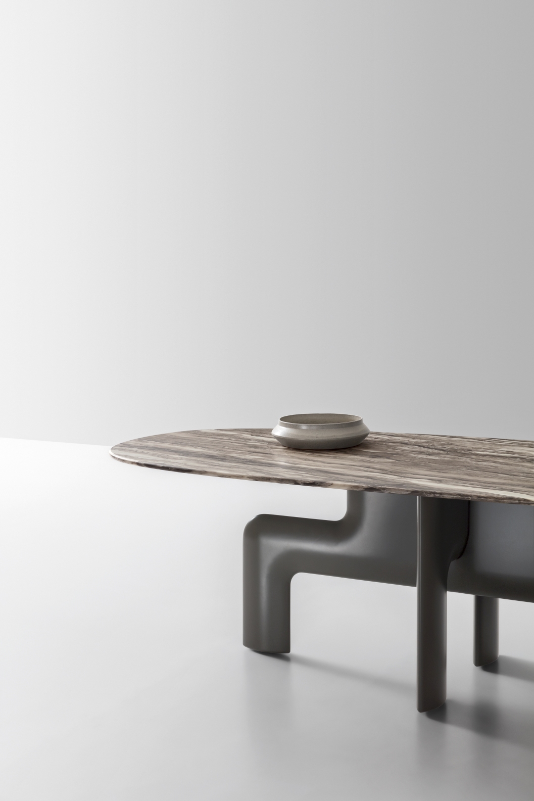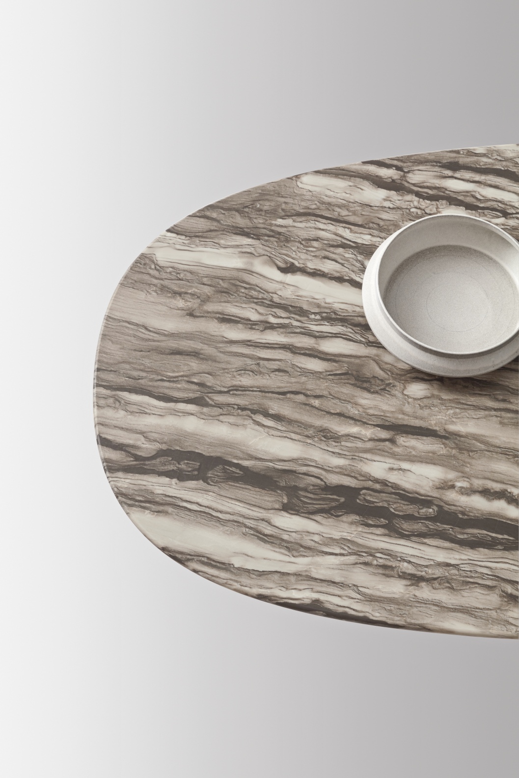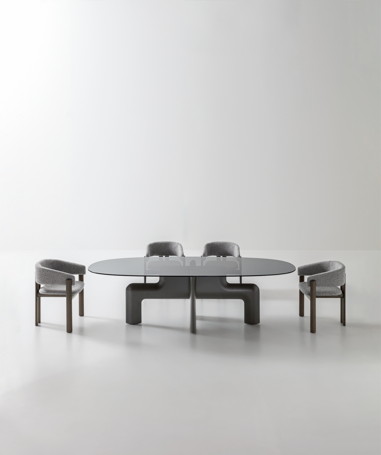 Привлекательные и утонченные формы создают композицию, состоящую из стола различных размеров и стула, обтянутого кожей или тканью. Оригинальный и одновременно классический дизайн сервиза, похожий на городской пейзаж, гармонично объединяющий разные души.