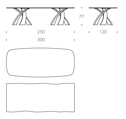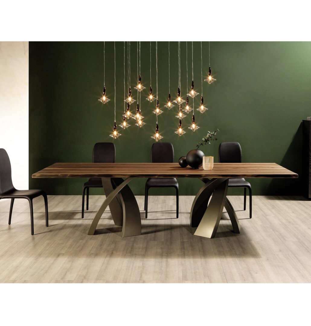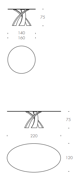 Эллипсы из дерева в различных эссенциях или из закаленного стекла, сваренного ультрафиолетовым излучением на стальной пластине; все опираются на основание из изогнутого и окрашенного металла, чтобы получить эффект большой эстетической изысканности. С Big Eliseo родился обеденный стол исключительной изысканности, также доступный в трехцветной версии и с двойным основанием, способный адаптироваться к комнатам разных размеров.