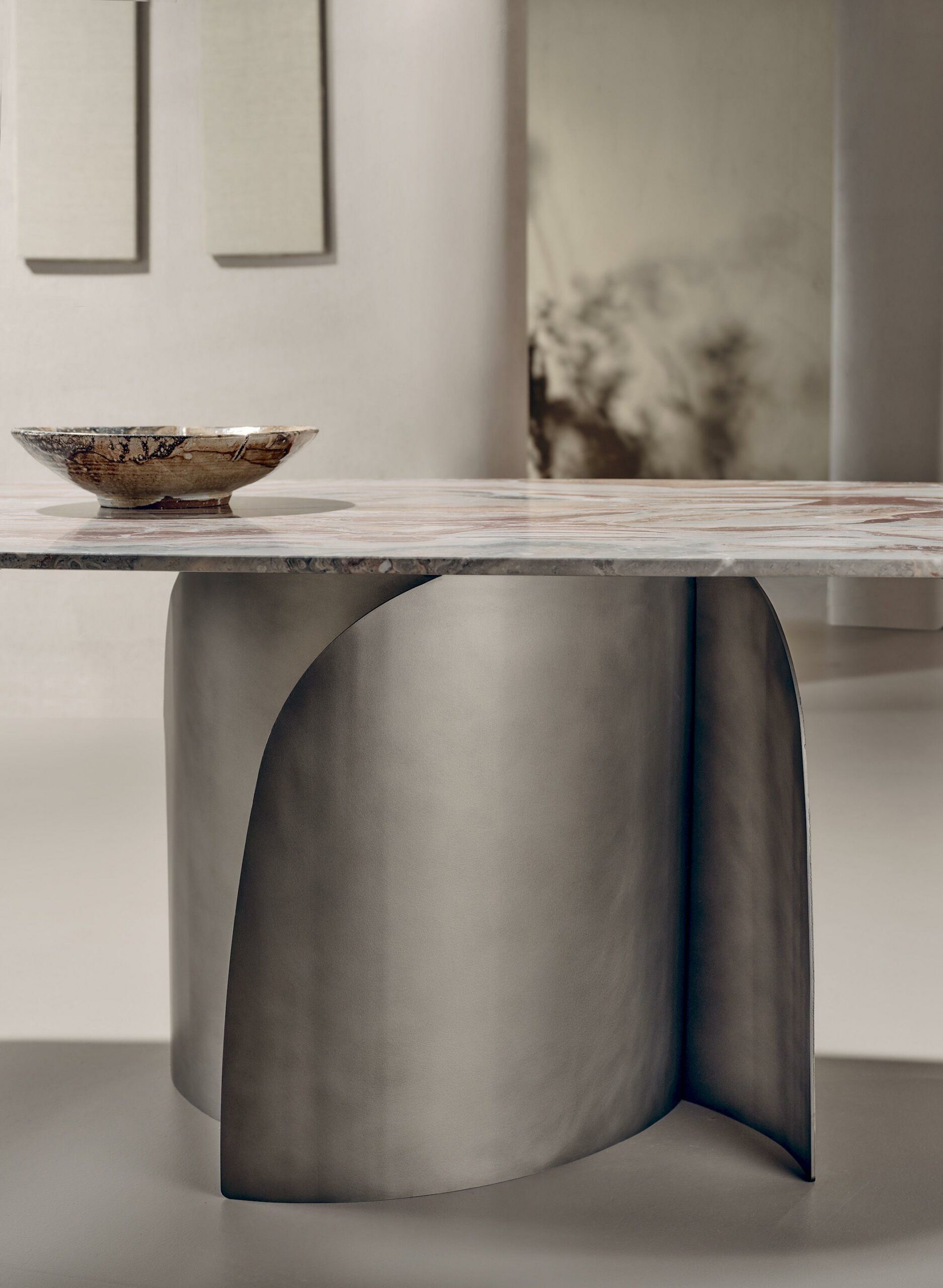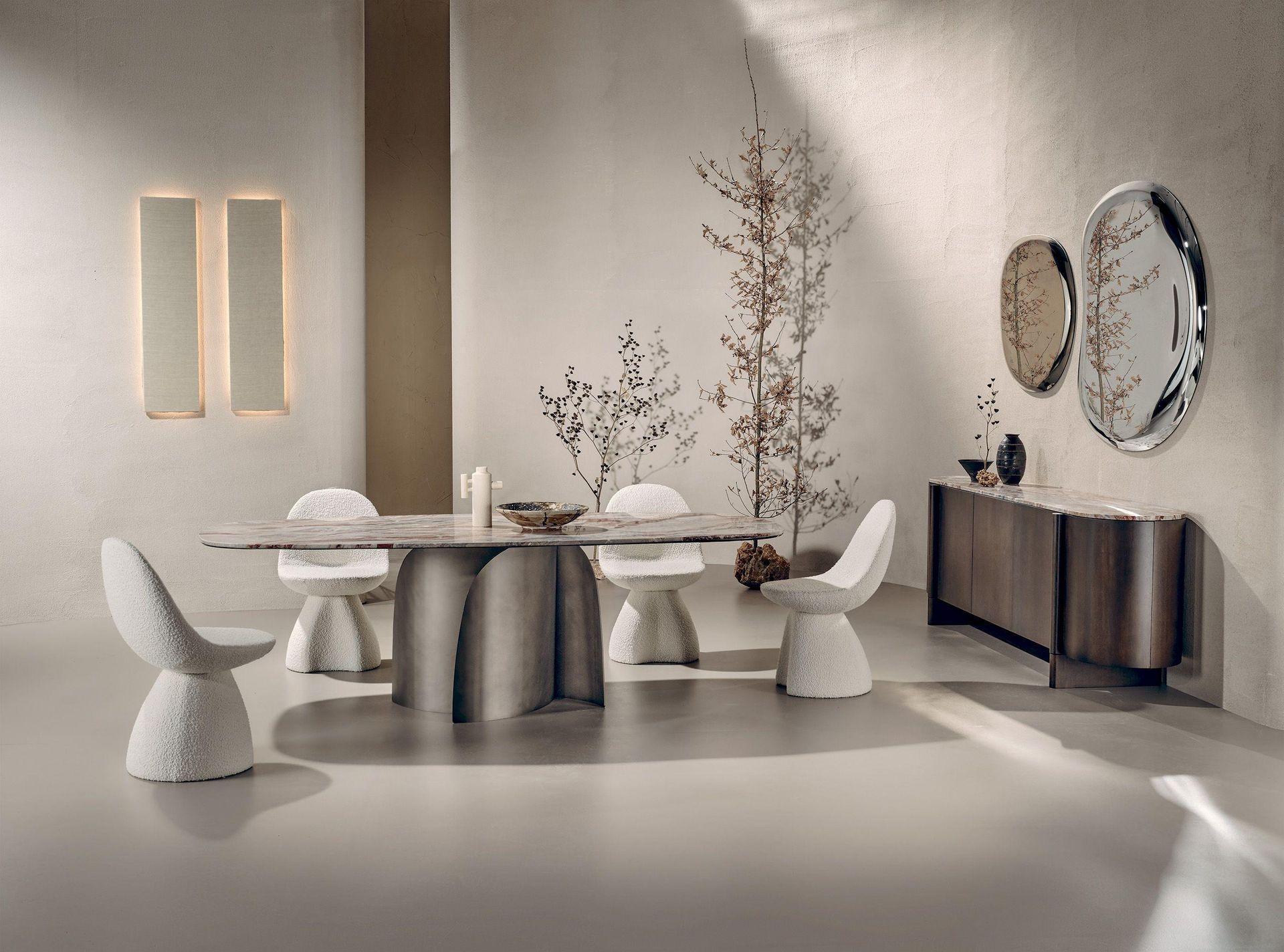 Основа стола Bloom выполнена из металла, но не в традиционном строгом стиле, а с элементами, напоминающими раскрывающиеся лепестки цветка. Этот эффект создает ощущение легкости и динамики, словно стол оживает на ваших глазах. Такое решение придает интерьеру нотку свежести и природной грации, превращая обычный предмет мебели в арт-объект.