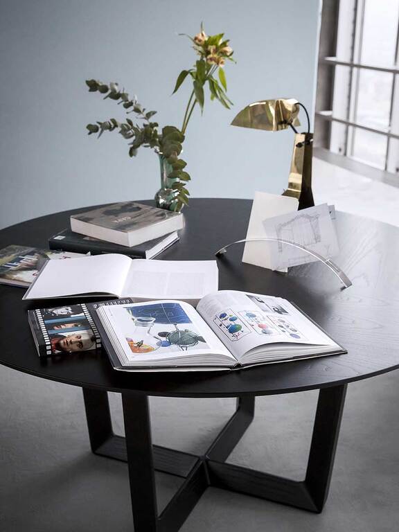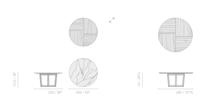 Несущая конструкция столов Bolero изготовлена из массива дерева треугольного сечения. Древесина может быть ясенем, окрашена в цвета венге или мока, или орехом Каналетто. Столешница может быть выполнена из дерева или мрамора. Деревянная версия поставляется с облицовкой из ясеня, окрашенного в цвета венге или мока, или ореха Каналетто с характерной инкрустацией в виде перекрещивающихся зерен, которые всегда сочетаются с ножками. Края декорированы отделкой из цельного дерева. Варианты столов Bolero размером 220х110 см и 250х100 см, а также круглая версия диаметром 150 см также доступны со столешницей из золотого мрамора Calacatta или мрамора Emperador, со скошенным краем и полированным полиэстеровым покрытием. Круглая версия диаметром 180 см также доступна с подставкой Lazy Susan, которая стоит на столешнице, а не закреплена на ней, и состоит из двух круглых плоских поверхностей разного диаметра.