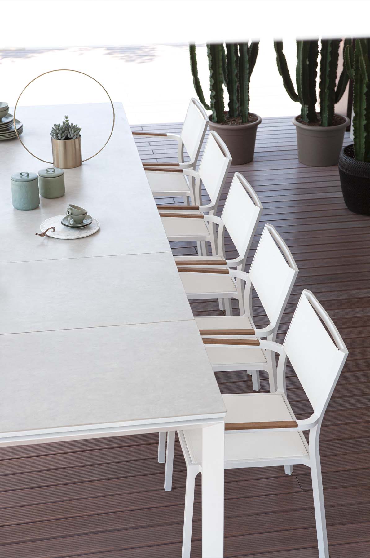 Благодаря алюминиевому основанию и столешнице из керамогранита длина стола-моста может достигать 340 см. Его очень легко выдвигать благодаря исключительно плавному механизму, встроенному в центральную часть стола, который обеспечивает практичное и легкое выдвижение и максимальную устойчивость.