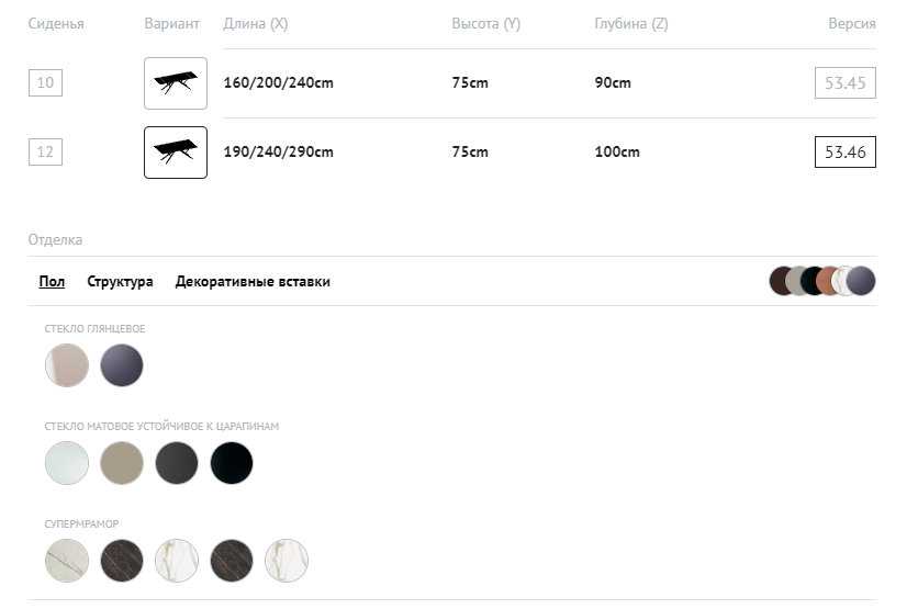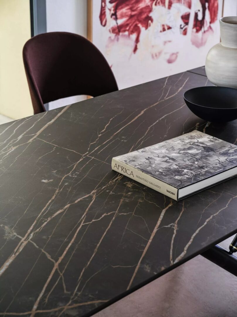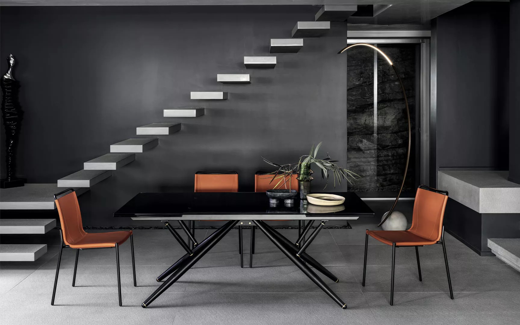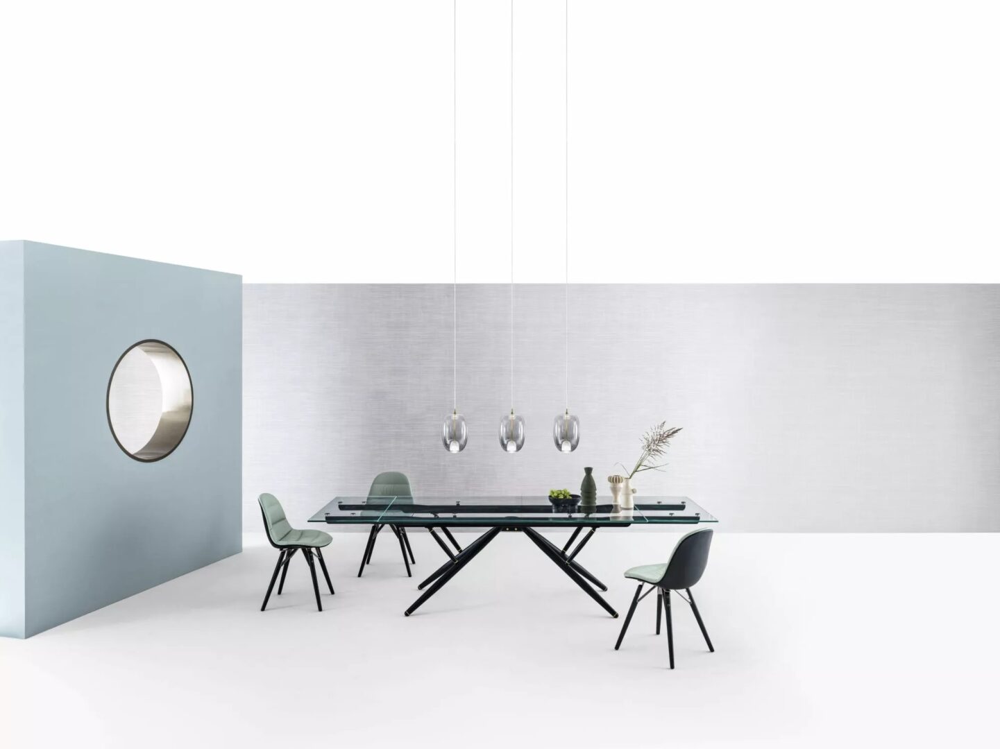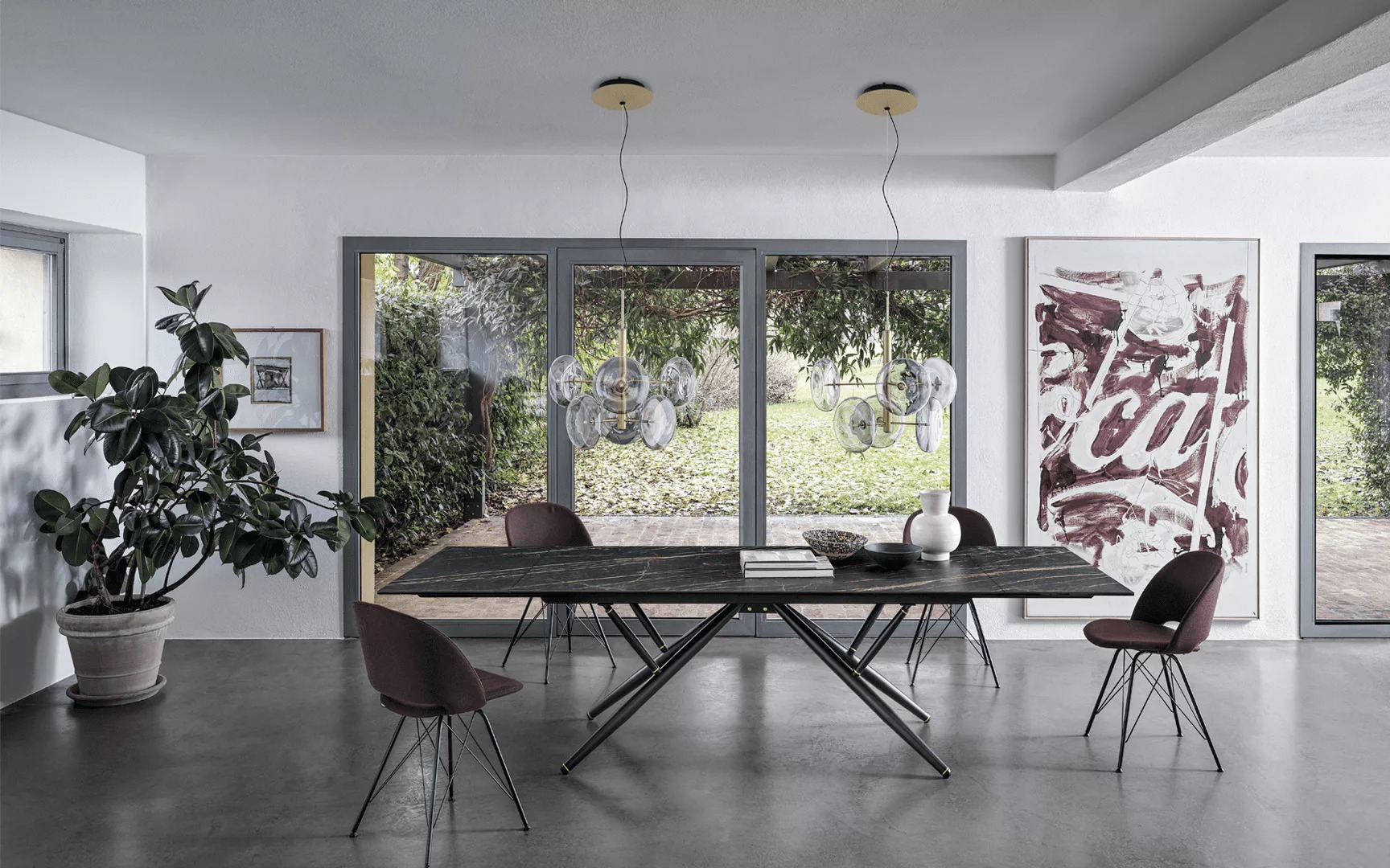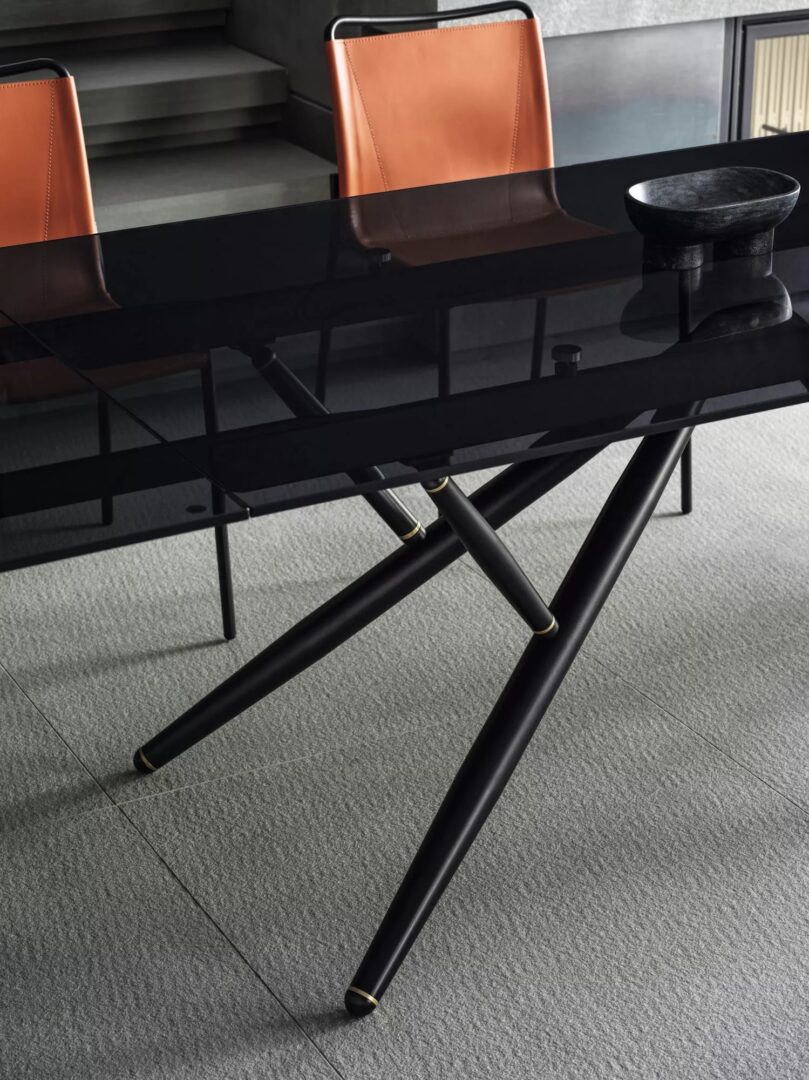 Стол раскладной и нераскладной, бочкообразная столешница и прямоугольная структура и декоративные детали из лакированной стали. Столешница из шпона, шпона с краями из массива, массива дерева, стекла, стекла, устойчивого к царапинам, СуперКерамики , СуперМрамора.