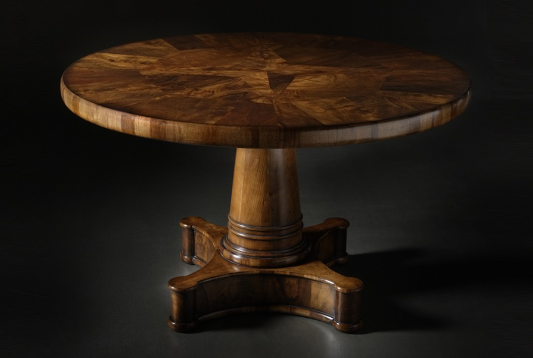 Обеденный стол, инкрустированный шиповником из Феррарского ореха. Цоколь и колонна из цельной вишни и силуэты из цельного ореха, обработанные поперечно.